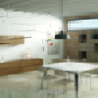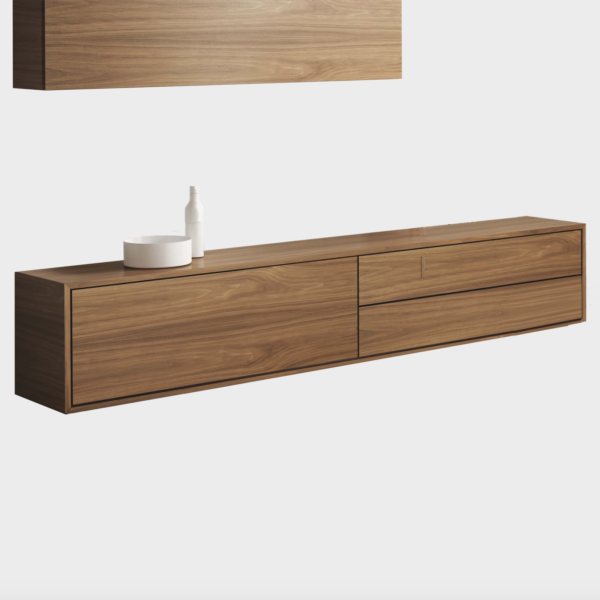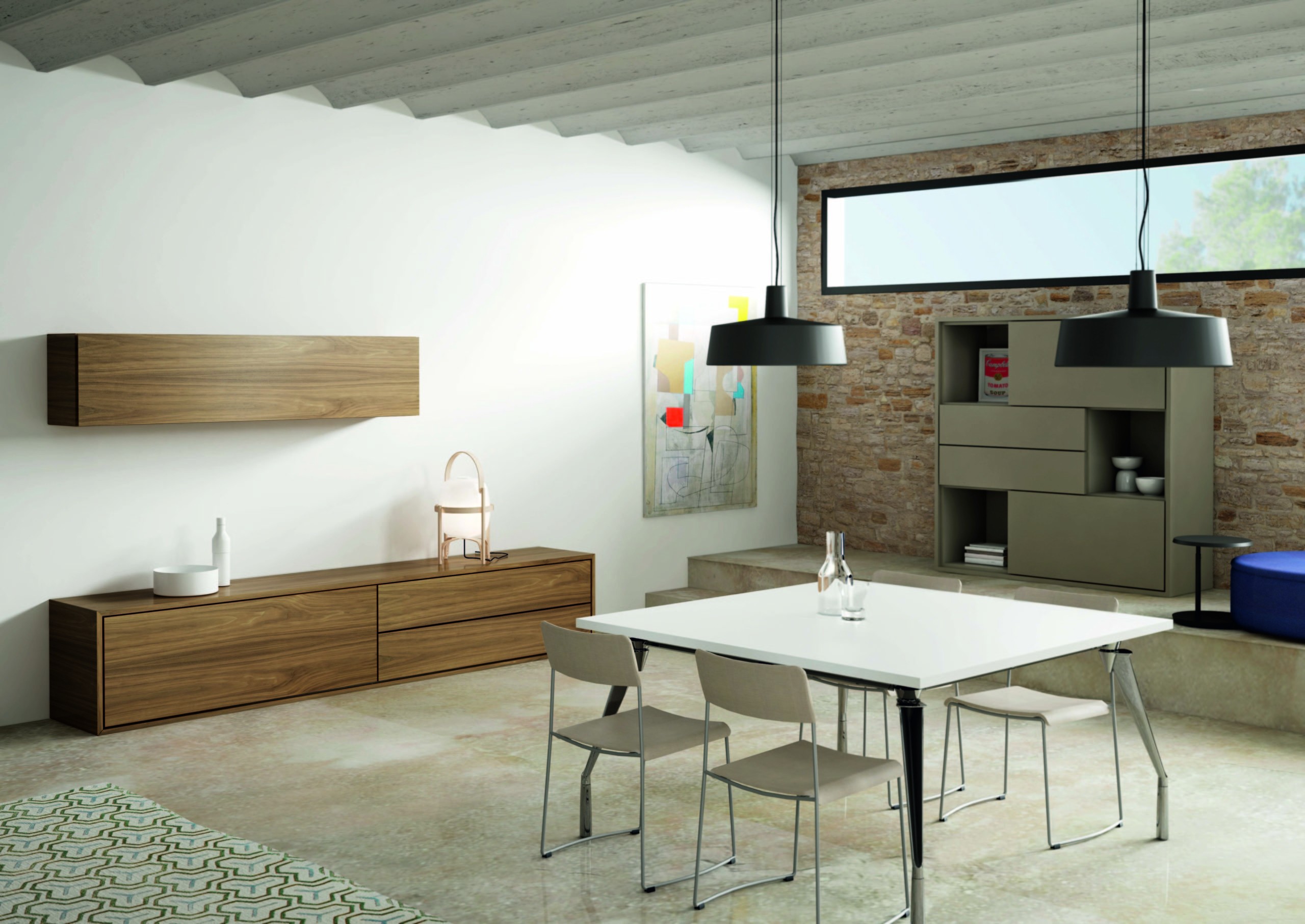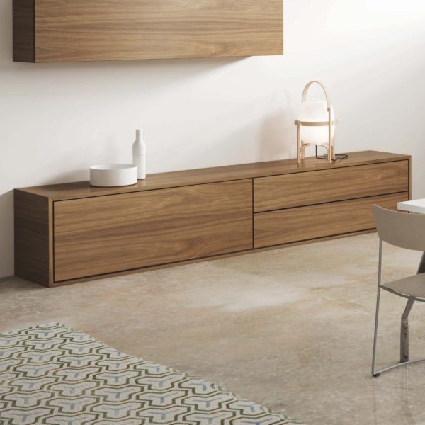 Its construction system is based on structural side and top panels which are 45 mm thick with a mitre joint of 45ยบ. The range has hinged, lift-up and swing doors; the opening and closing system for the drawers is activated via a push-and-pull button, and they can be removed fully. All the elements have the same finish inside and out.