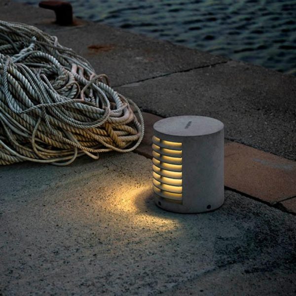 Bollard for outdoor installation that does not rust or degrade like metal. Plain, functional and hard as a rock. Three models available: Pe, Me and Gr. Structure created from a special material with stone-like qualities and manufactured by moulding. Watertight opal diffuser. IP65.