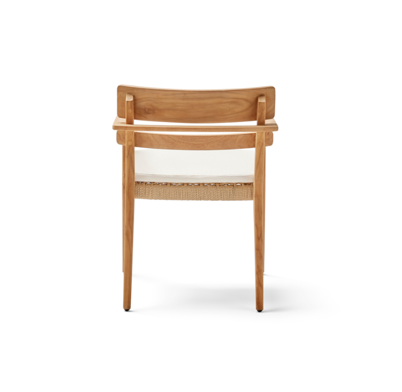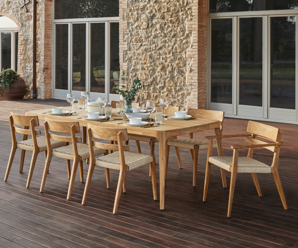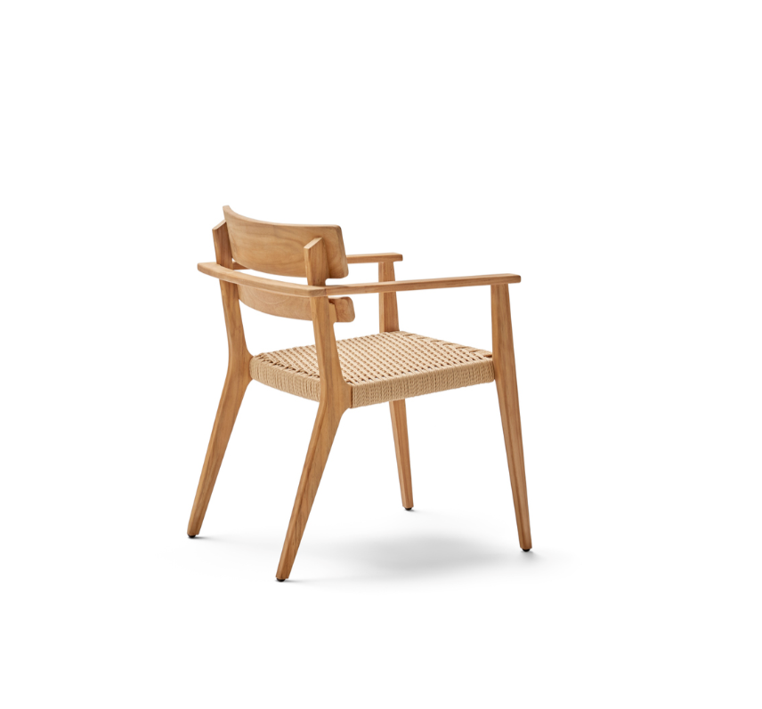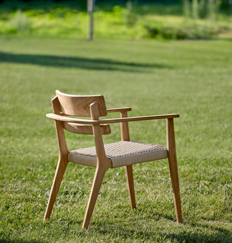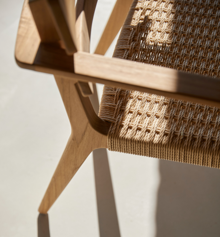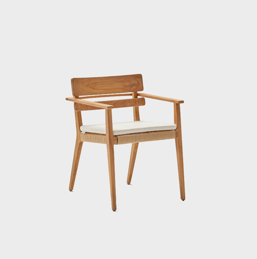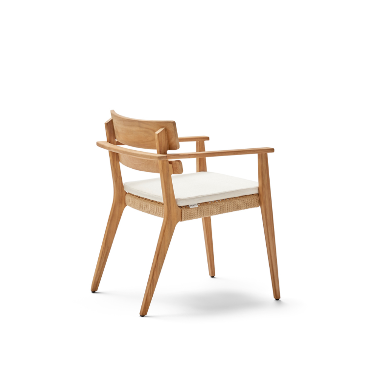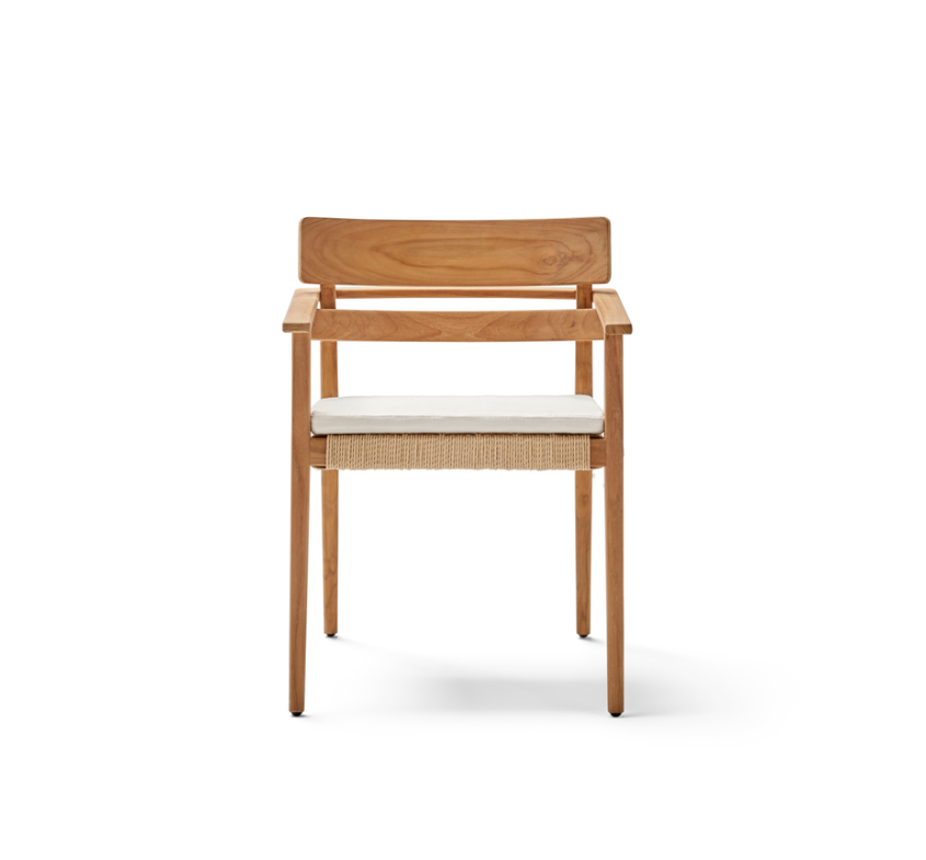 Frame in grade A teak from sustainable logging forests in Indonesia. Seat braided in synthetic rope. Optional seat cushion in high-strength 35 kg polyurethane foam with cover in Point sample fabric.
