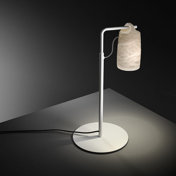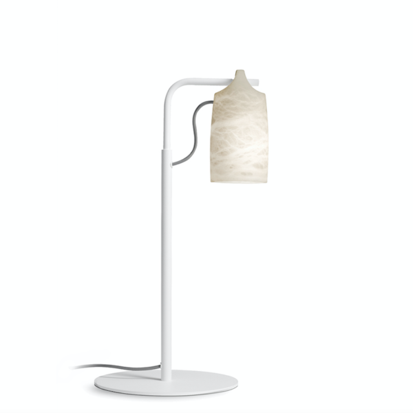 The structure is painted white textured iron, and the shade is of polished alabaster. Includes E14 socket and the light source is not included, allowing the end user to choose, of all the bulbs on the market, the one which intensity and temperature of light they prefer, either traditional (max.20W) or LED.