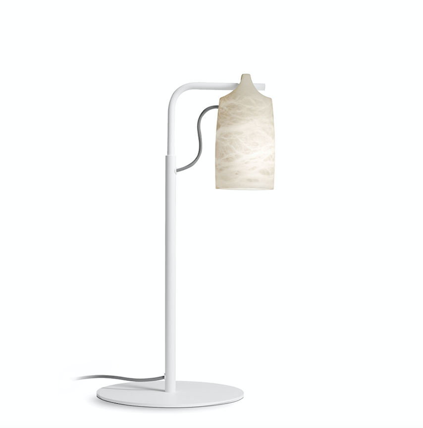 The structure is painted white textured iron, and the shade is of polished alabaster. Includes E14 socket and the light source is not included, allowing the end user to choose, of all the bulbs on the market, the one which intensity and temperature of light they prefer, either traditional (max.20W) or LED.