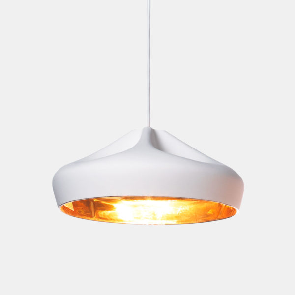 The brilliant white enamel interior creates a glitter effect, which enhances the light from the lamp. It can also be supplied in gold on the inside, which generates an extremely warm light. Ceramic diffuser with the inner part in brilliant white enamel or gold. Ceramic canopy. Fabric electrical cord.