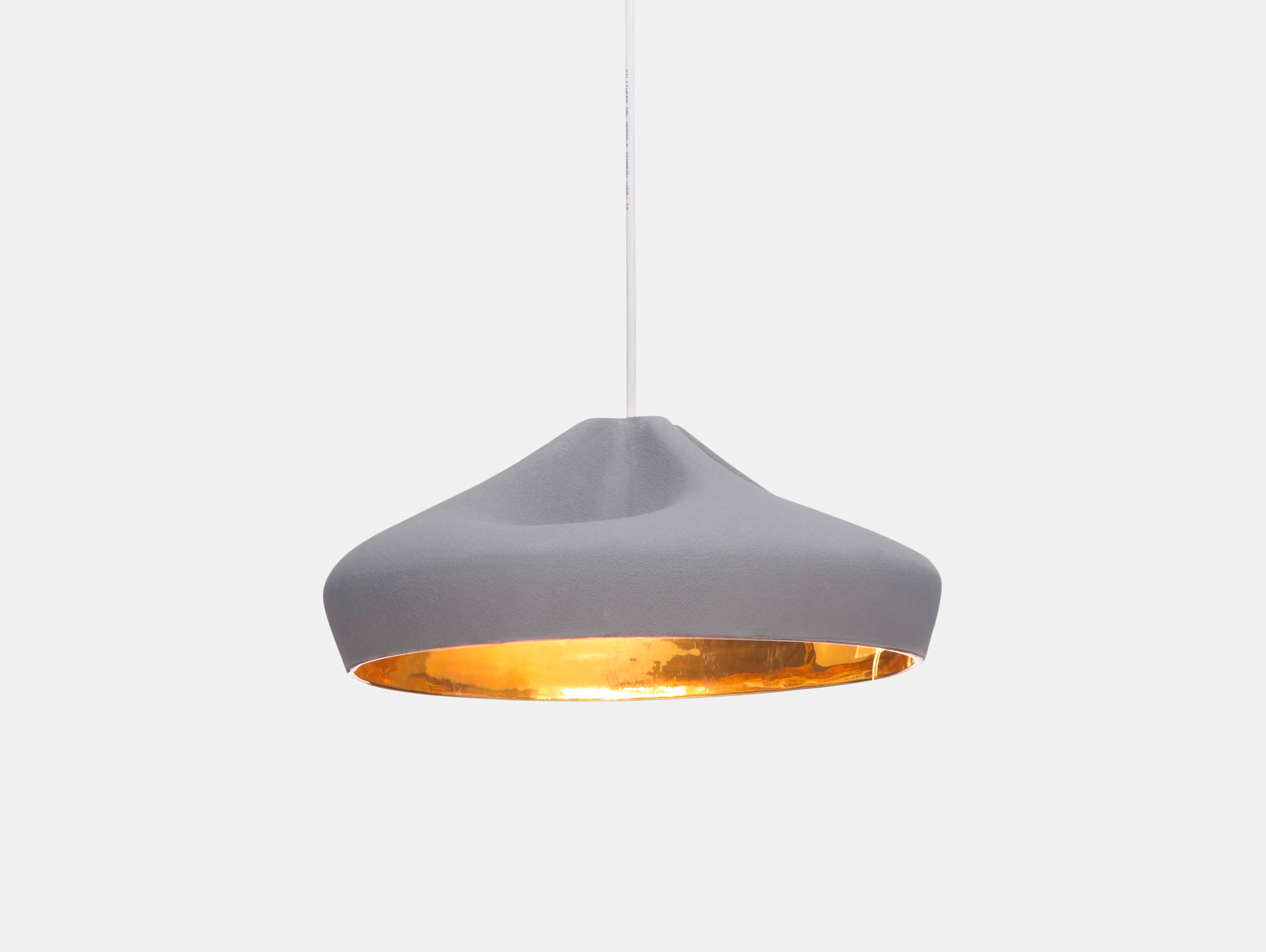 The brilliant white enamel interior creates a glitter effect, which enhances the light from the lamp. It can also be supplied in gold on the inside, which generates an extremely warm light. Ceramic diffuser with the inner part in brilliant white enamel or gold. Ceramic canopy. Fabric electrical cord.