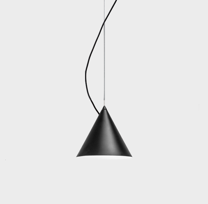 Suspension lamp for direct light. White repulsed aluminum conical screen painted in white Inside and painted in white, black, yellow, pink, light gray, dark gray or red rust in the Exterior. Floron painted in the same color as the outside of the screen. Includes fixing system and electrical connection. Adjustable stainless steel suspension cable. Textile electric cable.