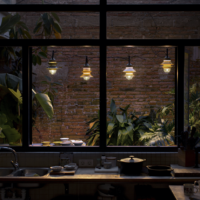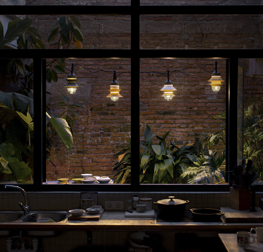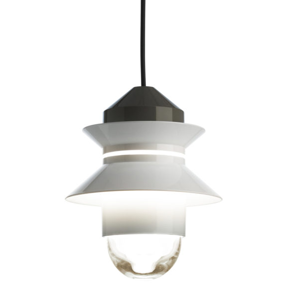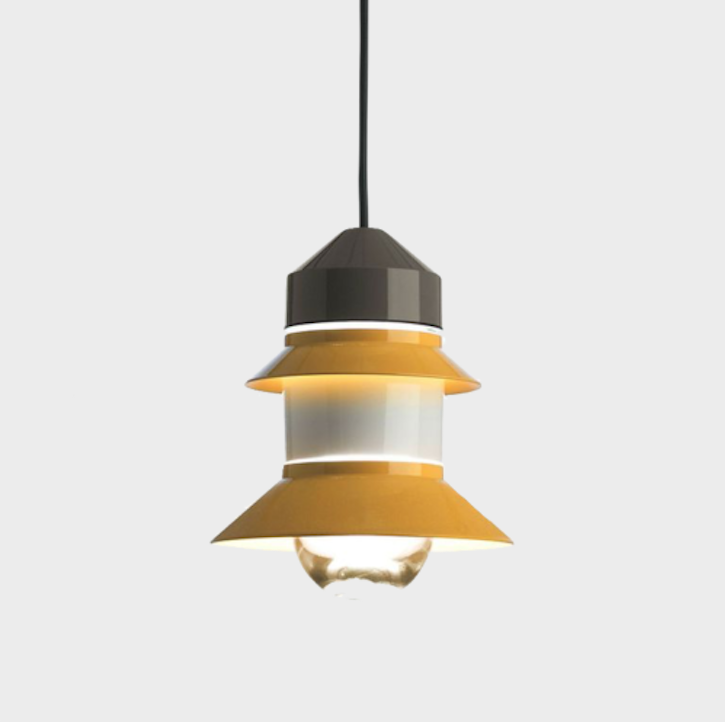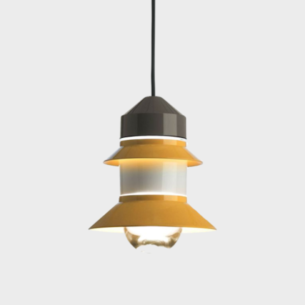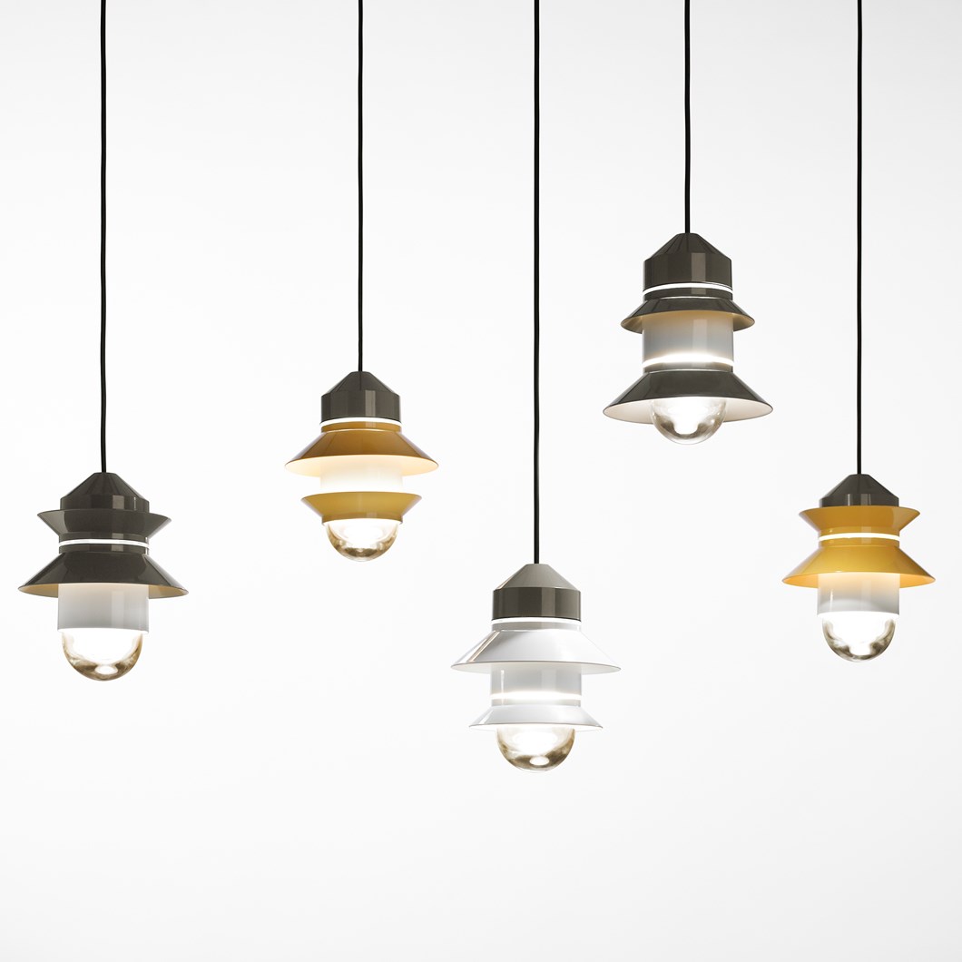 Inspired by the lanterns found on fishing boats, this collection of outdoor customizable lamps allows you to create multiple compositions. Users can choose how many shades to place on the diffuser, along with their order, position and direction. This interplay of combinations yields a rich array of direct or reflected light. The Santorini collection can be hung from the ceiling, either individually or clustered together, or they can be strung up like a garland. They also work as wall lamps or standing lamps using accessories that can easily be added. The variations on the Santorini lamp are further expanded by the choice of the shade color, which comes in white, grey and mustard.