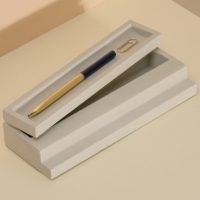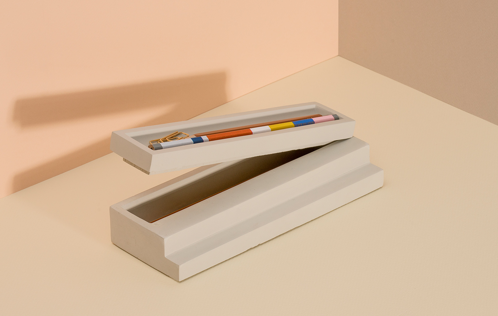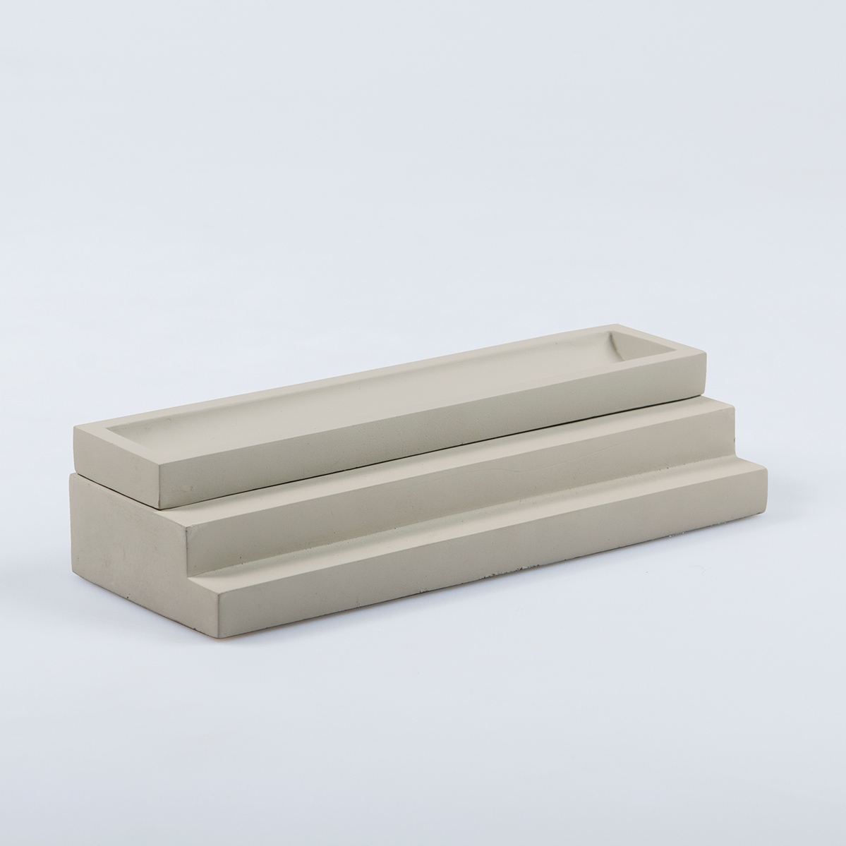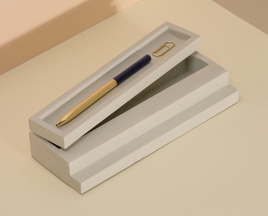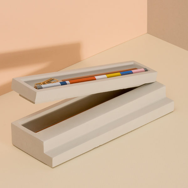 Elegant and contemporary architectural pen tray with lid made of pale grey concrete. It forms scenic stairs.