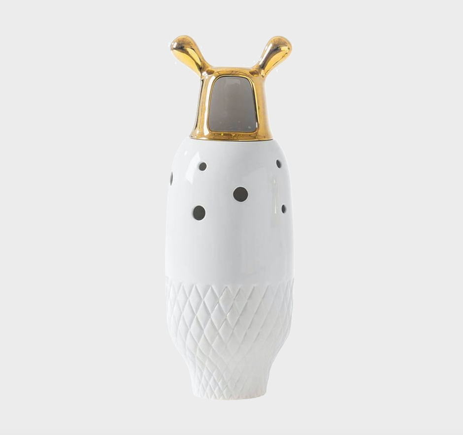 To celebrate the 10th anniversary of the Showtime Collection, we asked Jaime for new vase finishes. His proposal was 24 carat gold, which has been a great success. Made up of two pieces in glazed stoneware, with a white finish and 24 carat gold plated decorations.