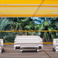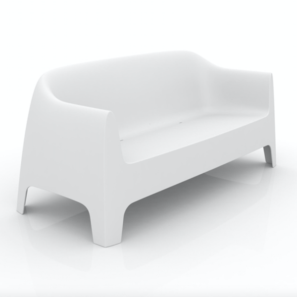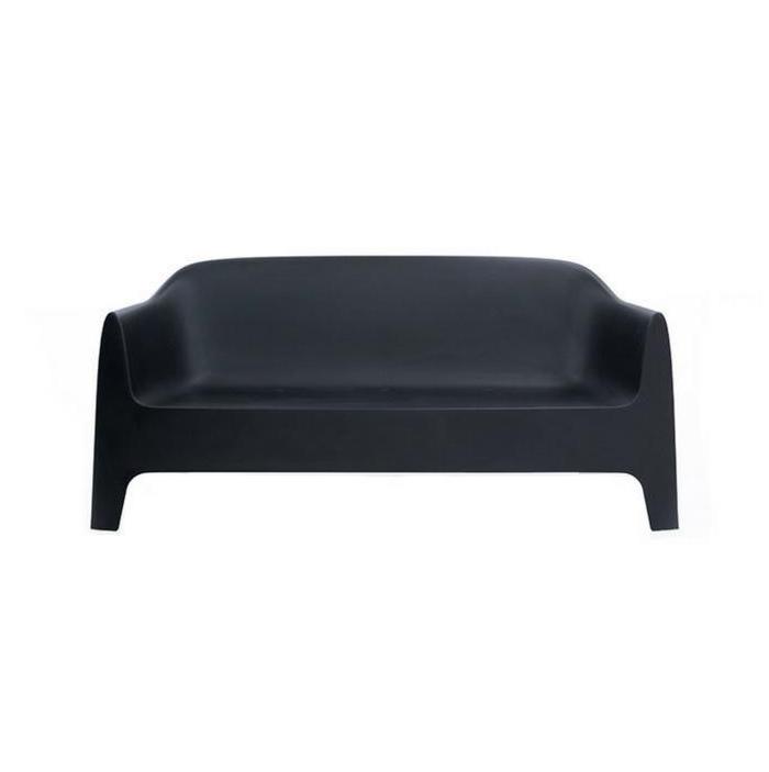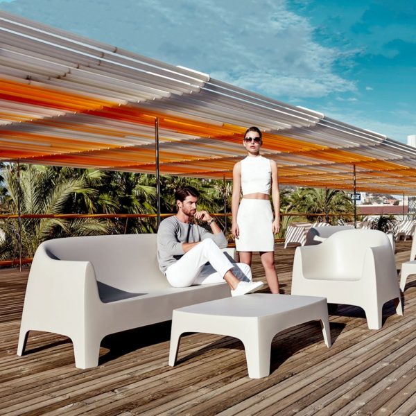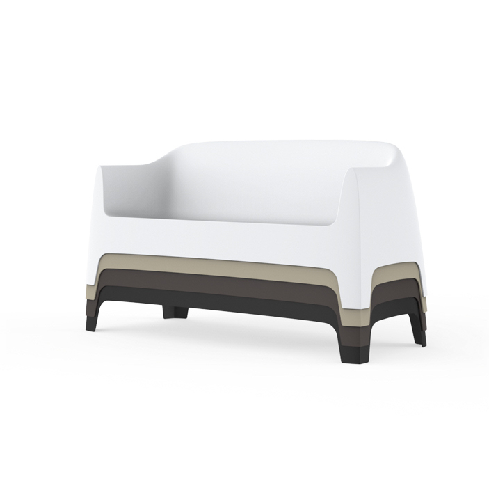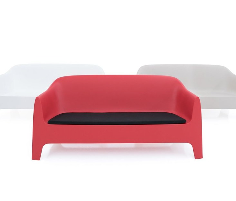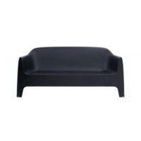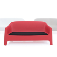 It is a group of items which, although being light offer stability thanks to their geometric and well-defined cut, as if they were sculpted from stone. The collection includes a sofa, an armchair, a chair, a chair with armrests, a table and a small table. It is a stackable and functional.