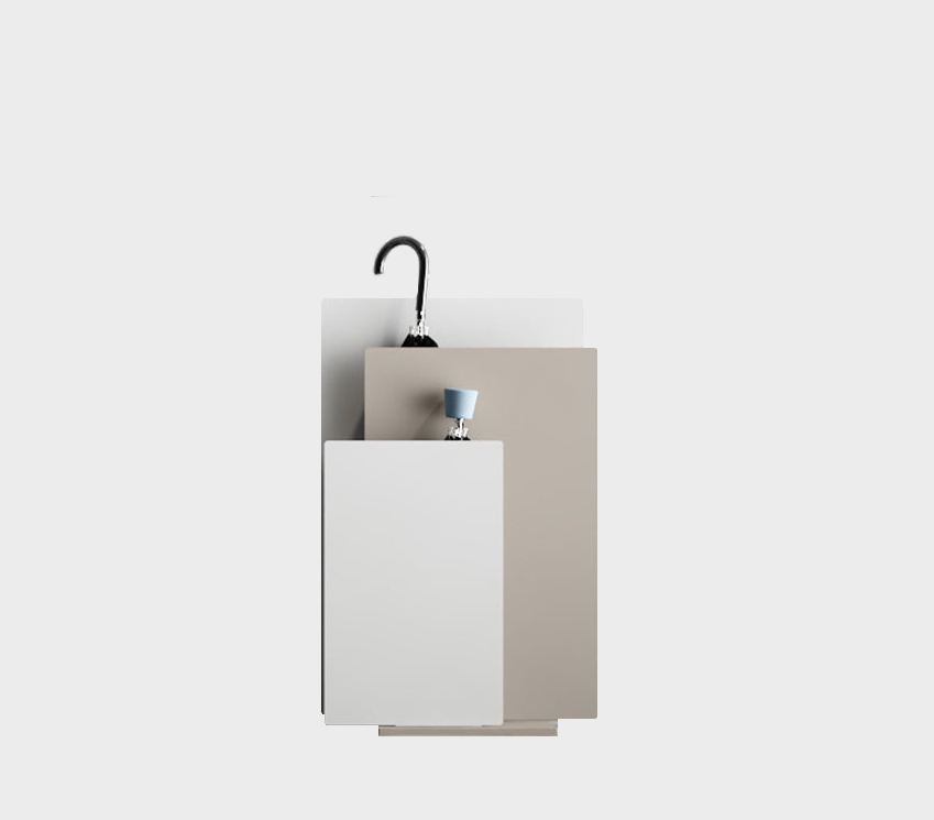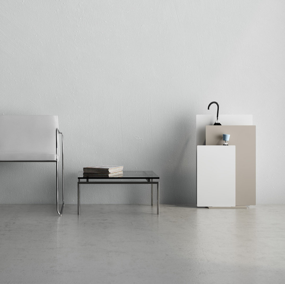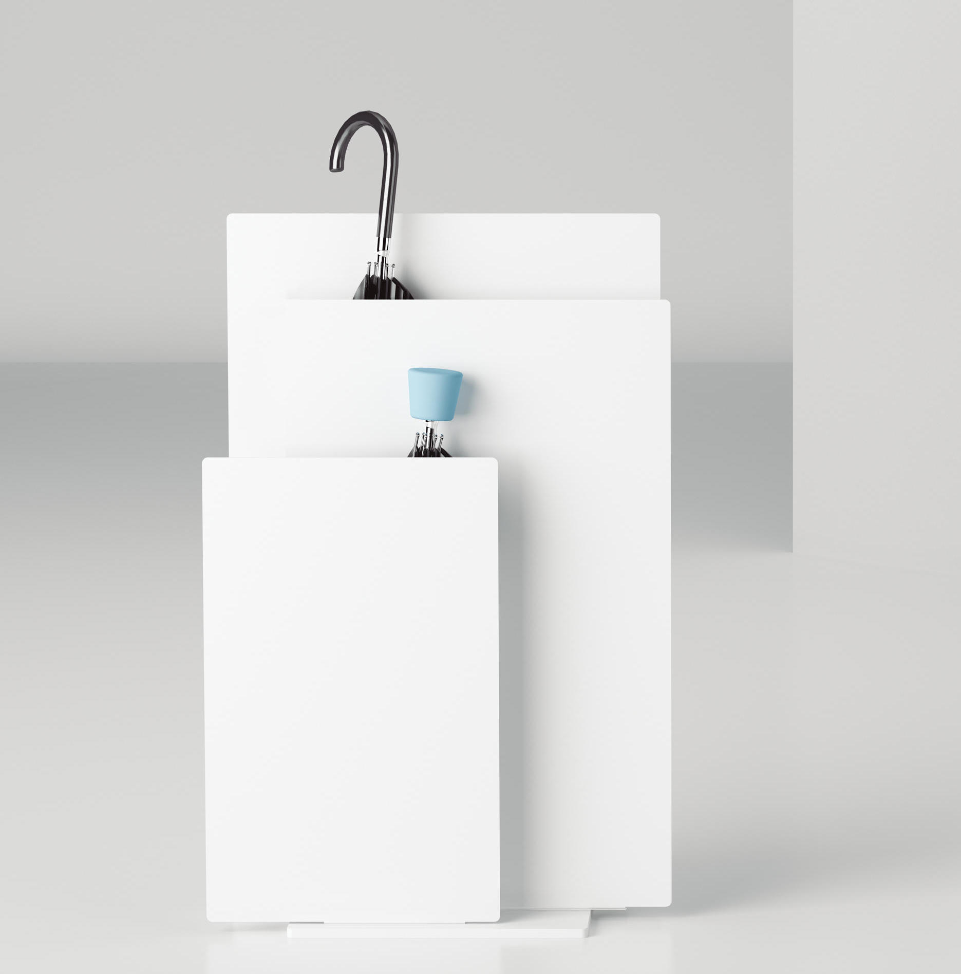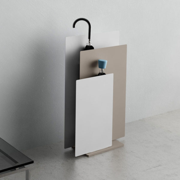 Umbrella stand composed of three painted steel panels thought-out for either big or small umbrellas. Standing version. More colour options available upon request, see spec sheet.