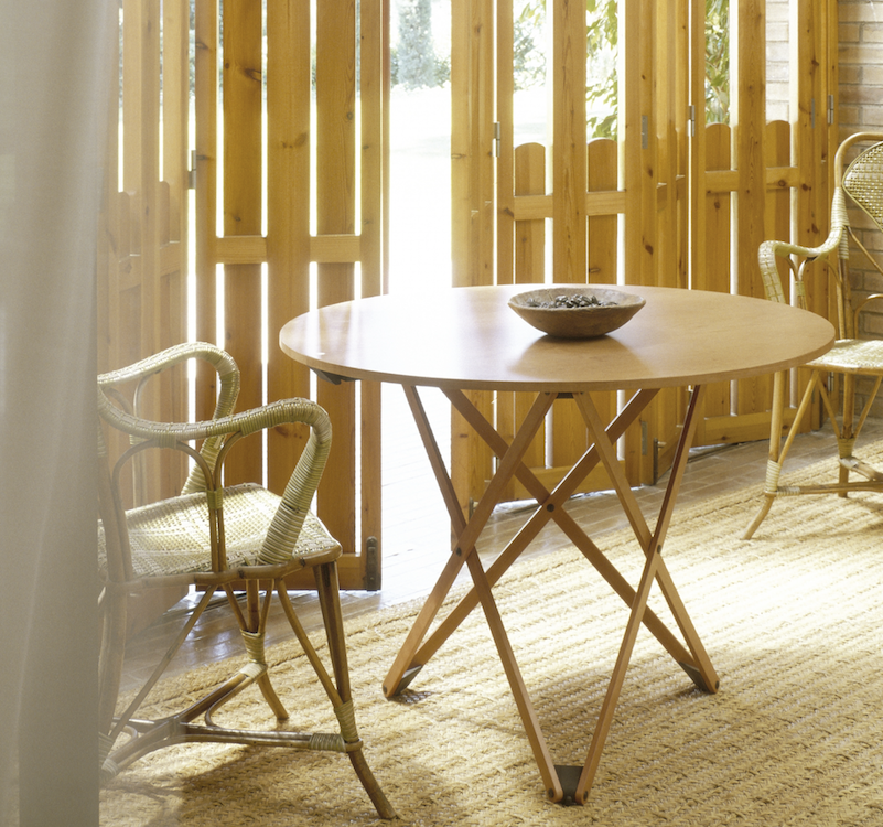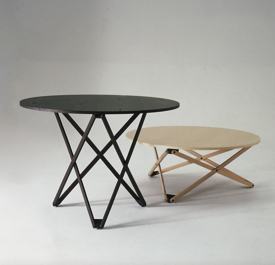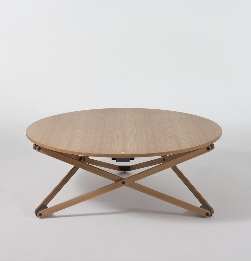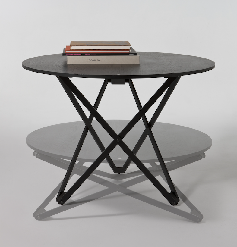 A multipurpose round table with a wooden top and articulated legs that can be adjusted to seven heights. The height is adjusted by means of a smart mechanism, the lever of which is shown by a white point on the table top. The best legacy from the catalogue by Disform, a Barcelona editing company that ceased to exist in 1998.