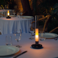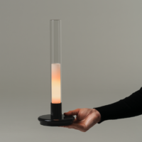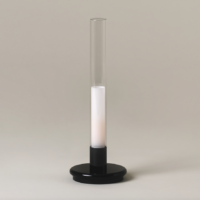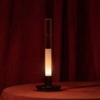 Its discreet circular base needs little surface area to house a rechargeable battery. Simply press the outer tube down to activate the switch, adjusting accordingly, to full or medium strength.