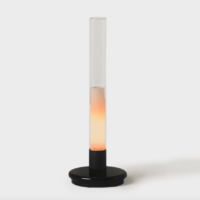 Its discreet circular base needs little surface area to house a rechargeable battery. Simply press the outer tube down to activate the switch, adjusting accordingly, to full or medium strength.