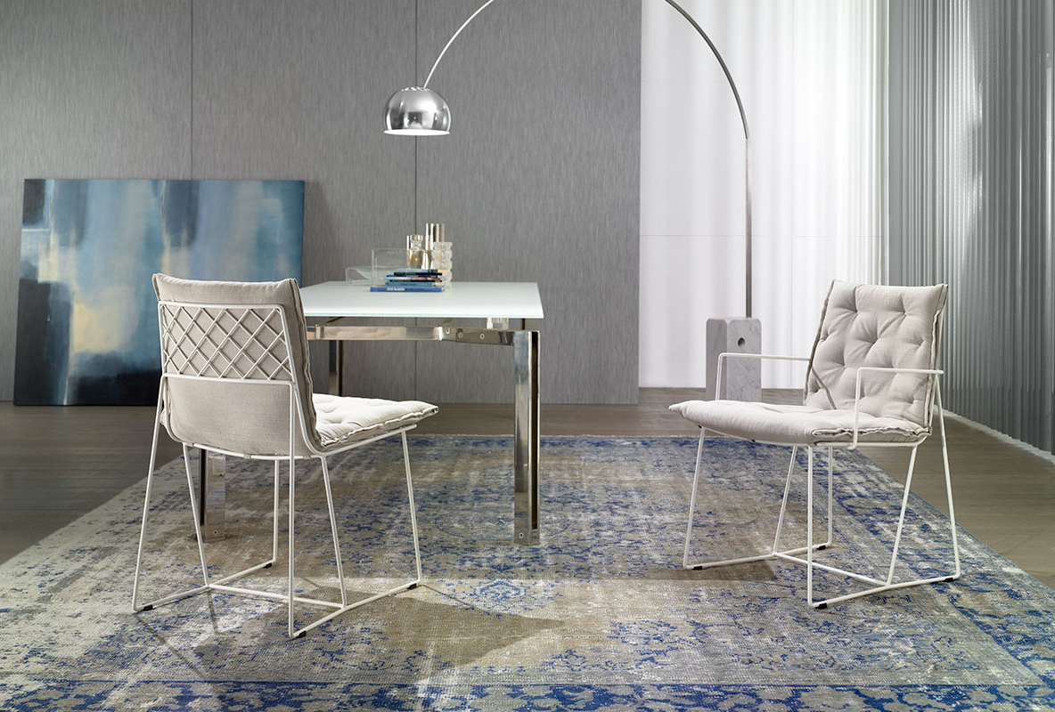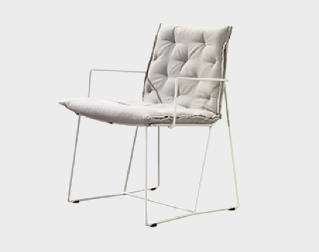 The Syrma collection is conceived as a visually light product, combining many intertwined wires. This appearance of lightness is achieved by a metal mesh and a perimeter of rod. In order to obtain a comfortable seat it comes with a capitoné pad fixed to the mesh. It is available in three colours (copper, white or dark grey), the capitoné and the side zipper combine with the colour of the structure. The collection includes chair, armchair, high-backed armchair and footstool.