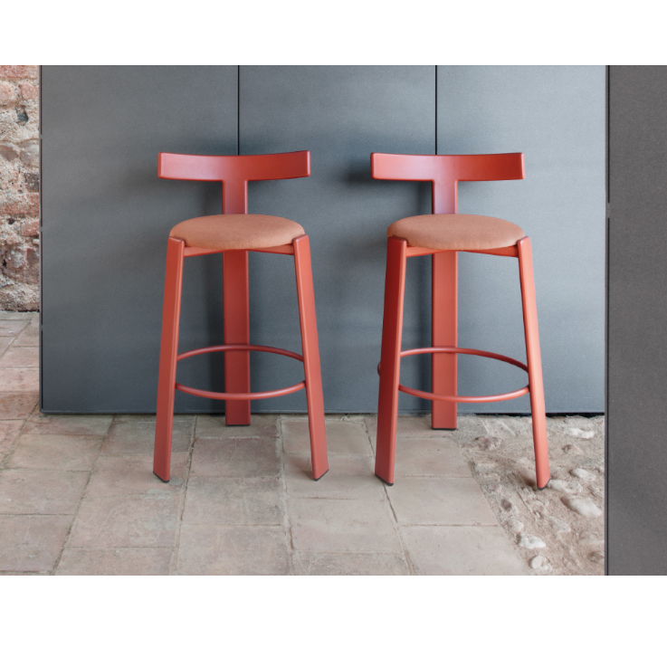 T bar stool. Powder-coated aluminium frame. Available in eight colours (see in spec sheet): cream 34, grey 56, snow white 70, sand 74, oxide 75, terracotta 72, ficus 73, sky blue 71. High resistance cushion in 35kg polyurethane foam with fabric cover from Point’s sample book.