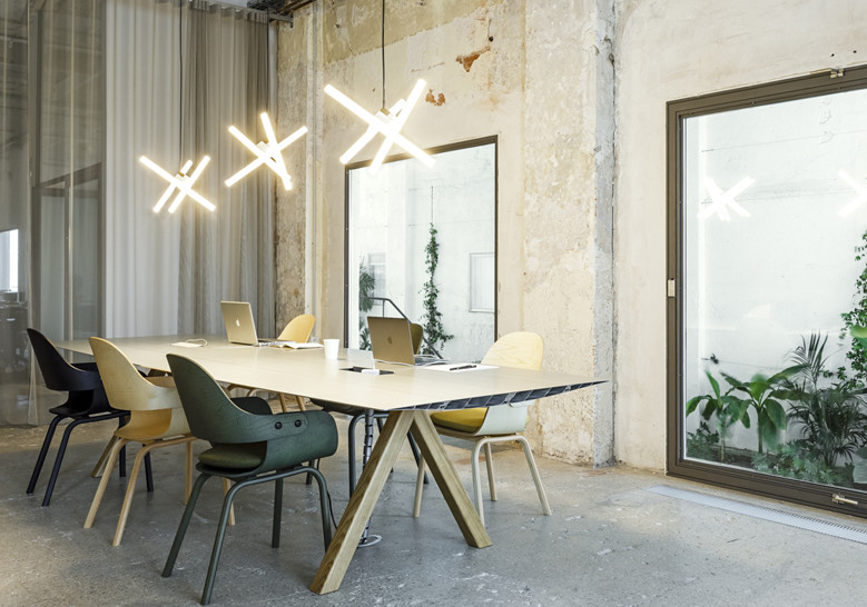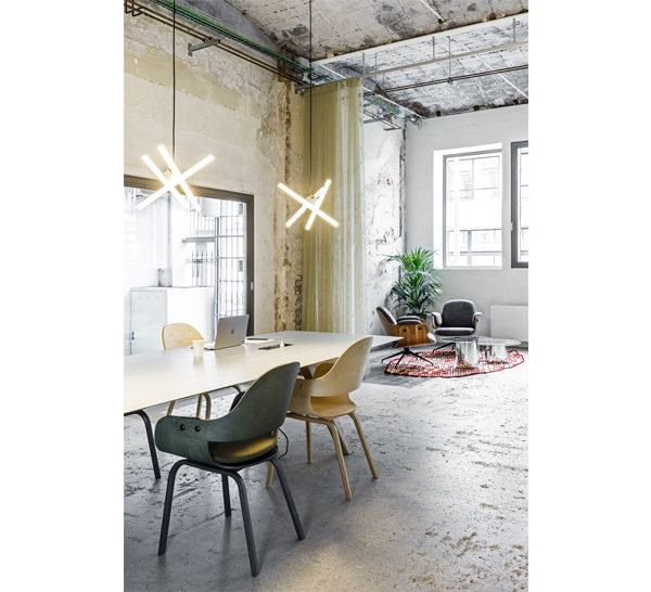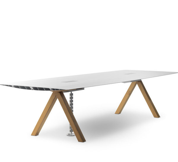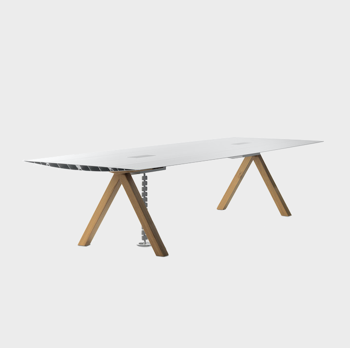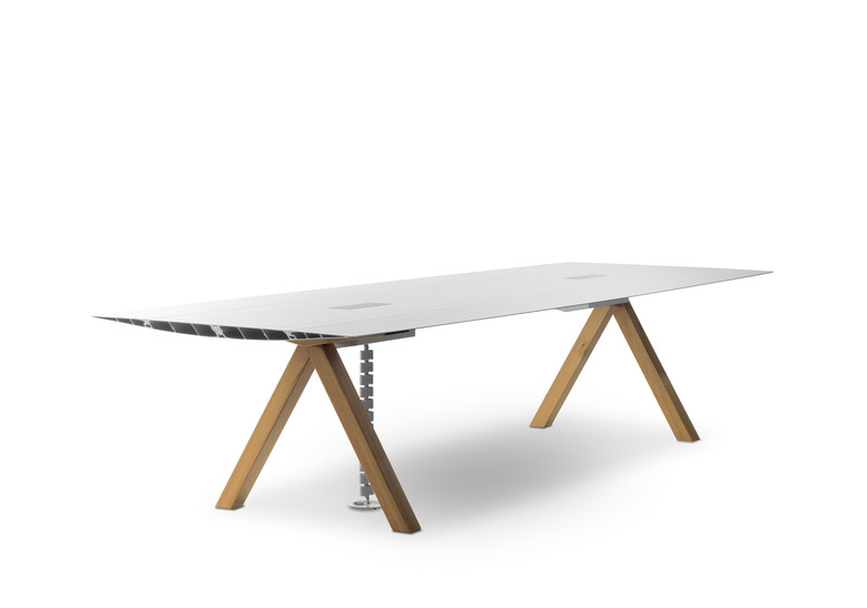 Extruded aluminium top with Scotch polishing and anodized silver with open ends cut at 45º. There are two types of legs for the electrified table: stainless steel rod or in oak-coloured solid ash.