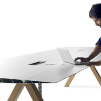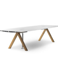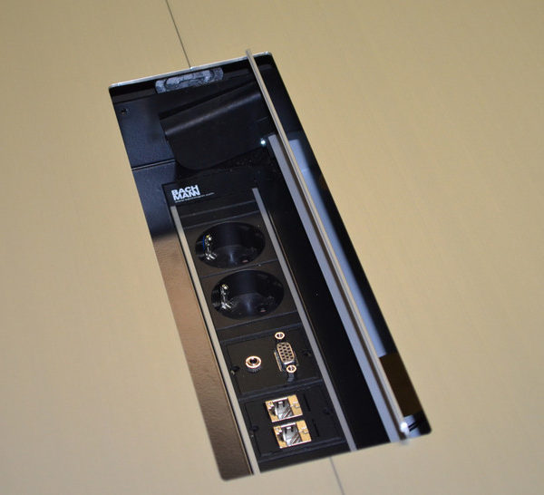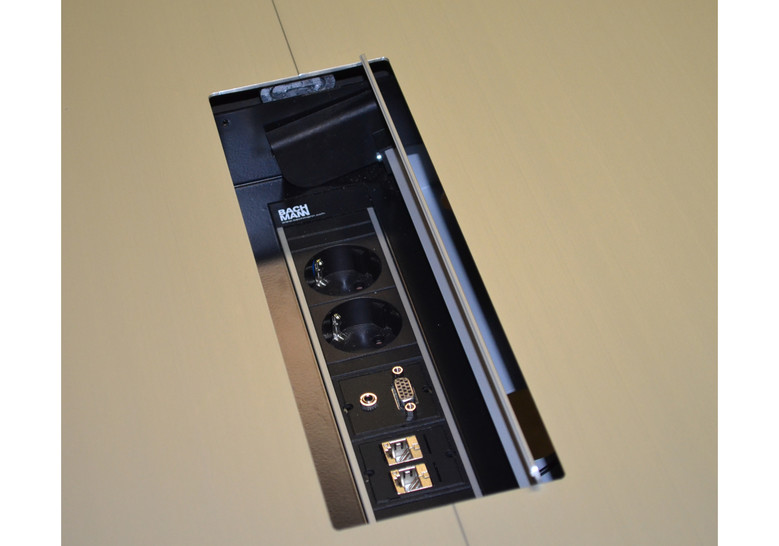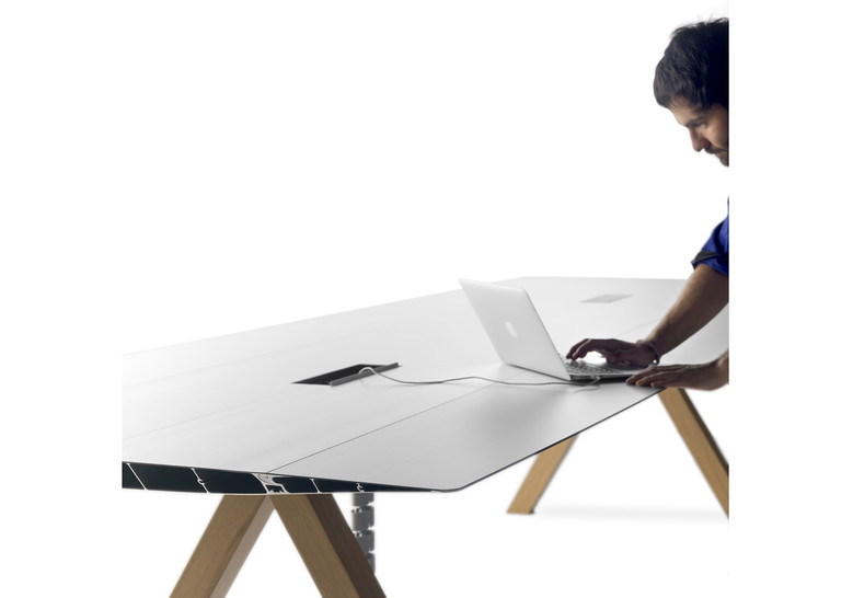 The Table B, which inaugurated the Extrusions Collection in 2009, can reach up to five metres using a simple profile of extruded aluminium. Its apparent simplicity covers a complex technical development where important engineers have participated. The result is a piece of excelling craftsmanship, carrying the German designers character. The Bachmann Cable Management system has an open-close anodised aluminium lid, permitting access to the inside from any point of the table. Included are power sockets, network and VGA + stereo connections.