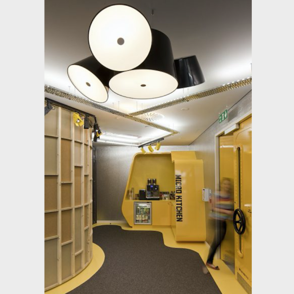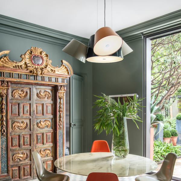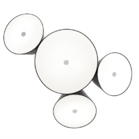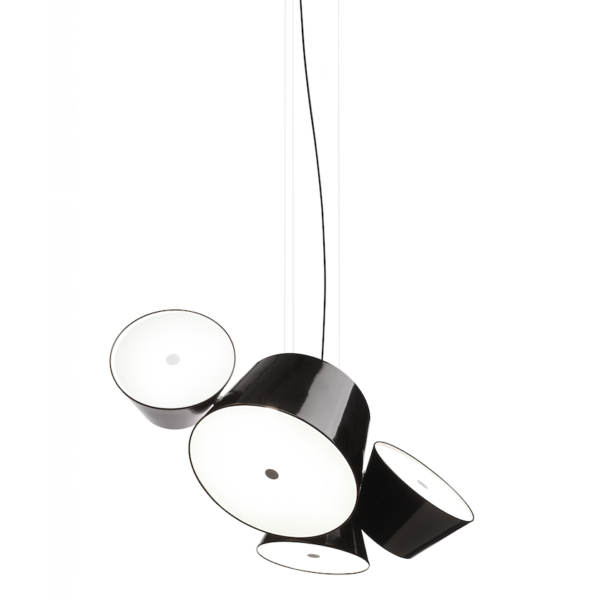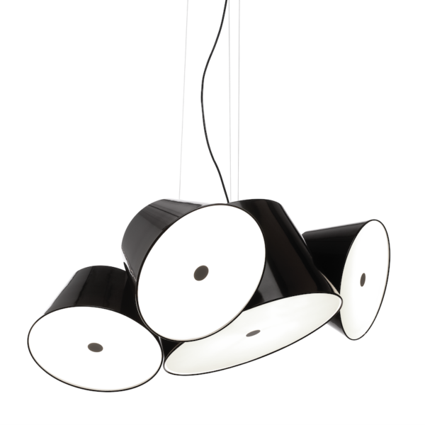 The Tam Tam consists of a central in lacquered aluminium, to which are attached various satellite shades which can be rotated through 360ยบ by means of a swivel mechanism. An opalescent, methacrylate diffuser over the open end softens the light.