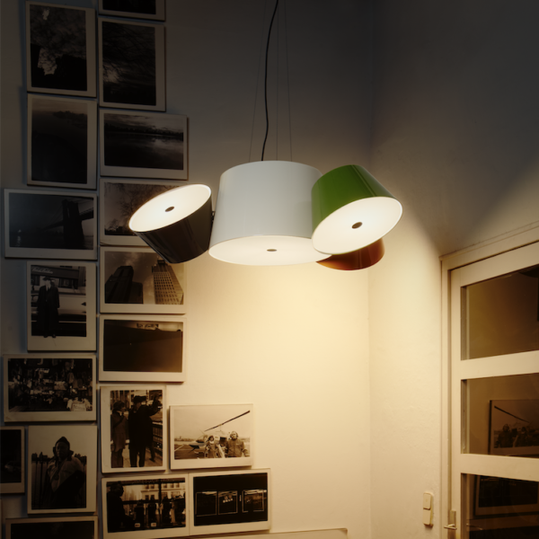 Tam Tam is available as a suspension lamp in two sizes: a regular size with either 3 or 5 satellite shades and a mini size with 3 satellite shades. In all of them, the central shade is available in black or off-white, and the satellite shades can be combined in black, off-white, orange, green, brown, sand and blue. Please specify the colour finishes the shades.