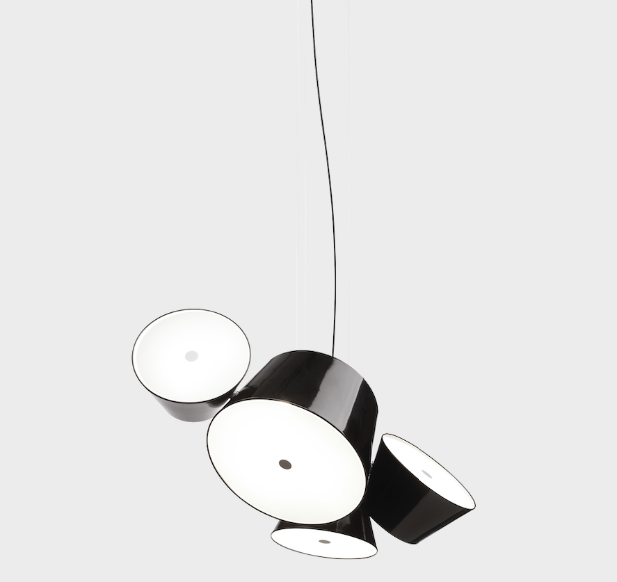 The Tam Tam consists of a central in lacquered aluminium, to which are attached various satellite shades which can be rotated through 360ยบ by means of a swivel mechanism. An opalescent, methacrylate diffuser over the open end softens the light.
