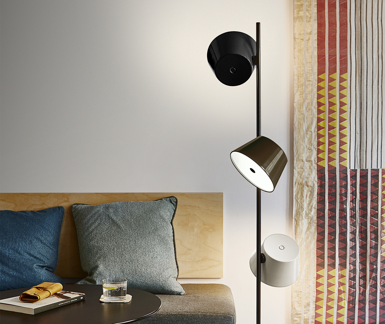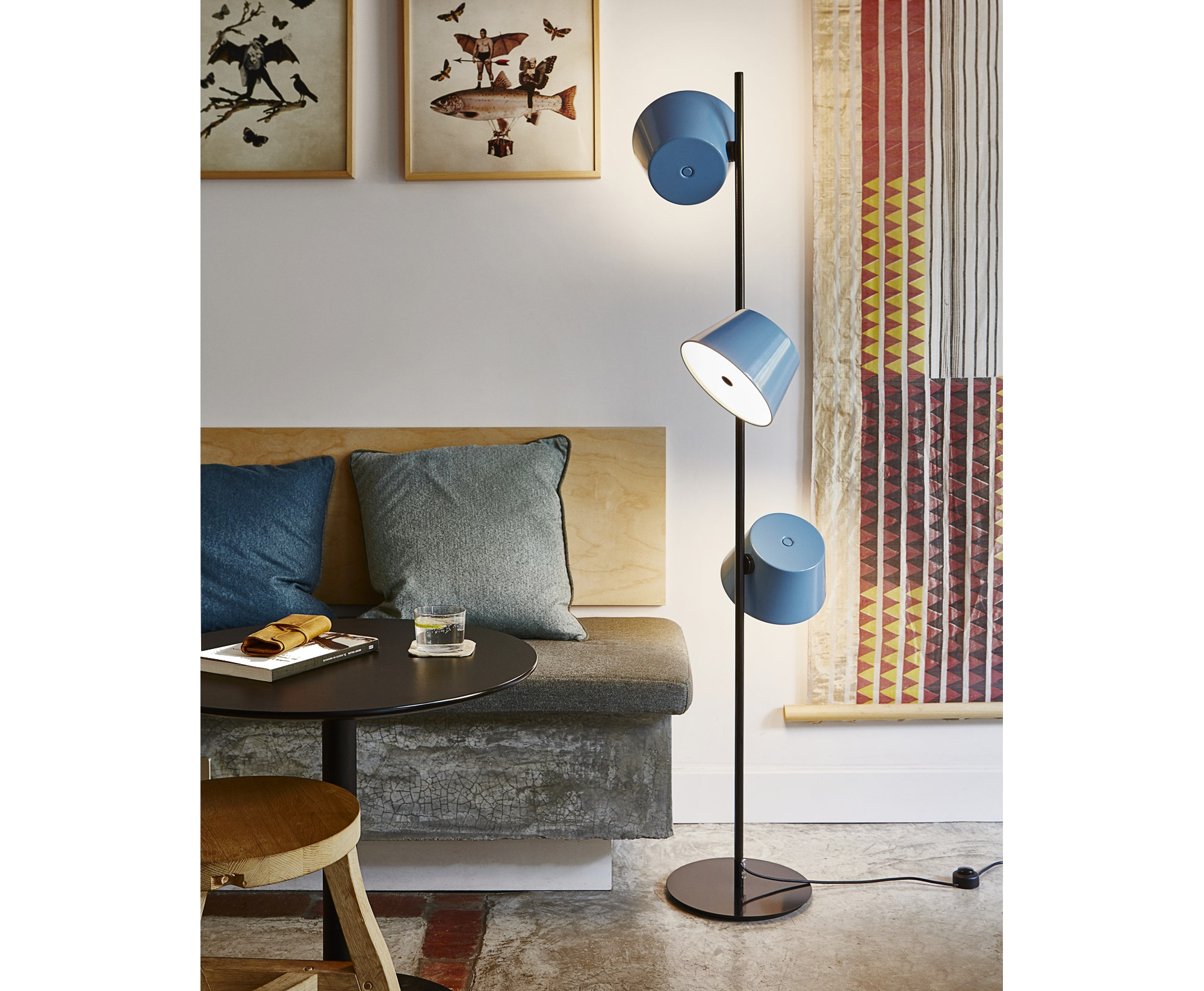 This year, the colorful, sonorous Tam Tam, already so multifunctional, now comes in a new linear version that retains its fun, dynamic roots. The new standing models have been simplified with the addition of a hanging pole to which colored lampshades are attached that can be oriented in any direction and come in a variety of colours. These new members of the Tam Tam family fit more multipurpose spaces, either long or narrow, lighting bars, a reading corner or an area of transit. Consumers can mix and match the color and number of lampshades to suit the aesthetic of each atmosphere, each interior and every need. Three shades version.