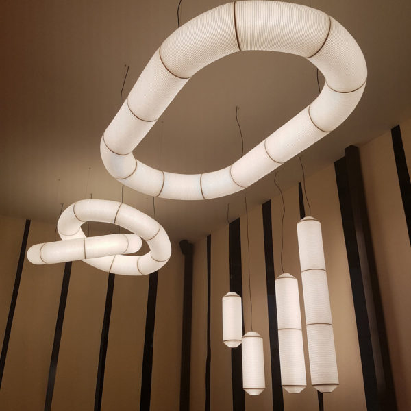 Tekiò, the Japanese word for adaptation, merges ancient artisan techniques with Warm to Dim LED technology that enables control of intensity and colour temperature. Tekiò combines traditional and avant-garde in a unique and contemporary design, featuring modern lighting structures carefully dressed in handmade paper. Linear or circular shapes can be created by combining various modules.