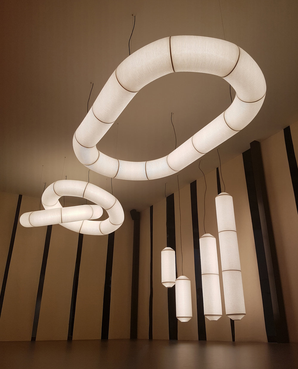 Tekiò, the Japanese word for adaptation, merges ancient artisan techniques with Warm to Dim LED technology that enables control of intensity and colour temperature. Tekiò combines traditional and avant-garde in a unique and contemporary design, featuring modern lighting structures carefully dressed in handmade paper. Linear or circular shapes can be created by combining various modules.