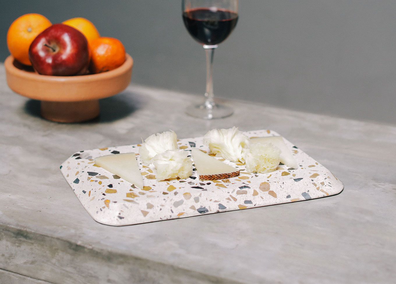 Material: Terrazzo, a composite material consisting of granite and marble chips set within a white cementitious binder.