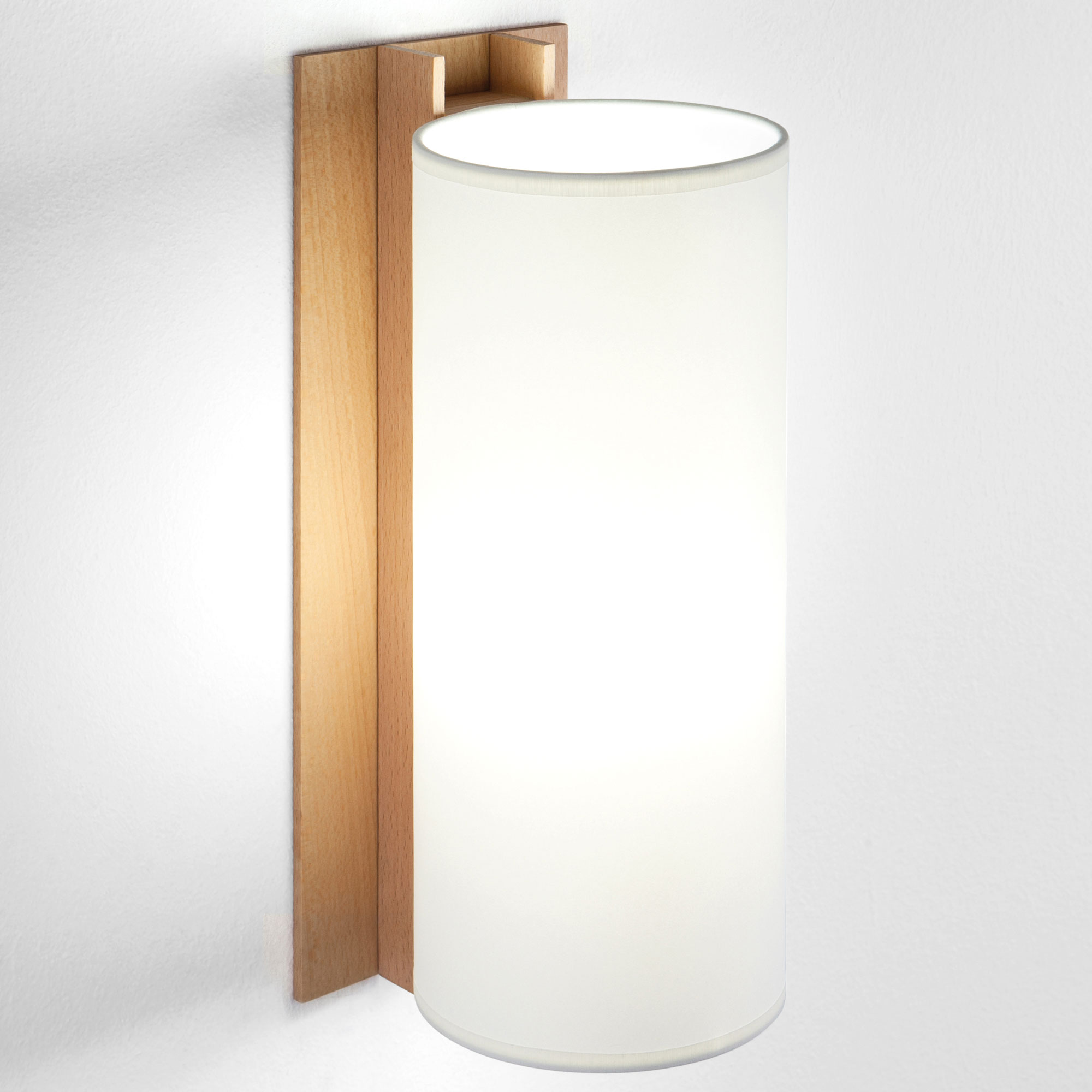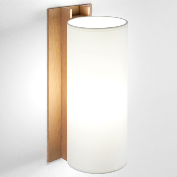 The TMM collection of short and long wall lamps comprises a simple beech channel into which the white or beige parchment shade is partially inserted. The short wall lamp can also come with the exterior cable, which doubles up as the light switch, or have a direct connection to the wall. Beech wood structure.