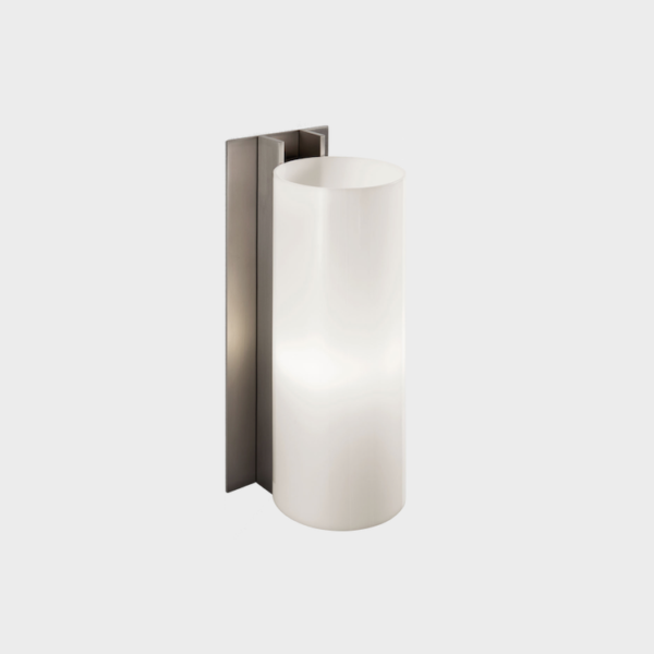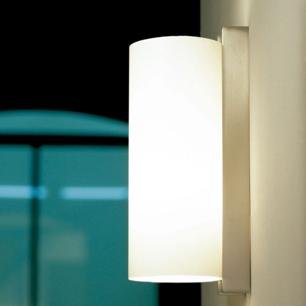 This variation on the long TMM wall lamp incorporates a metal channel and a white methacrylate shade, making both materials more damp resistant than their wooden and parchment counterparts. Satin nickel structure with white methacrylate shade.