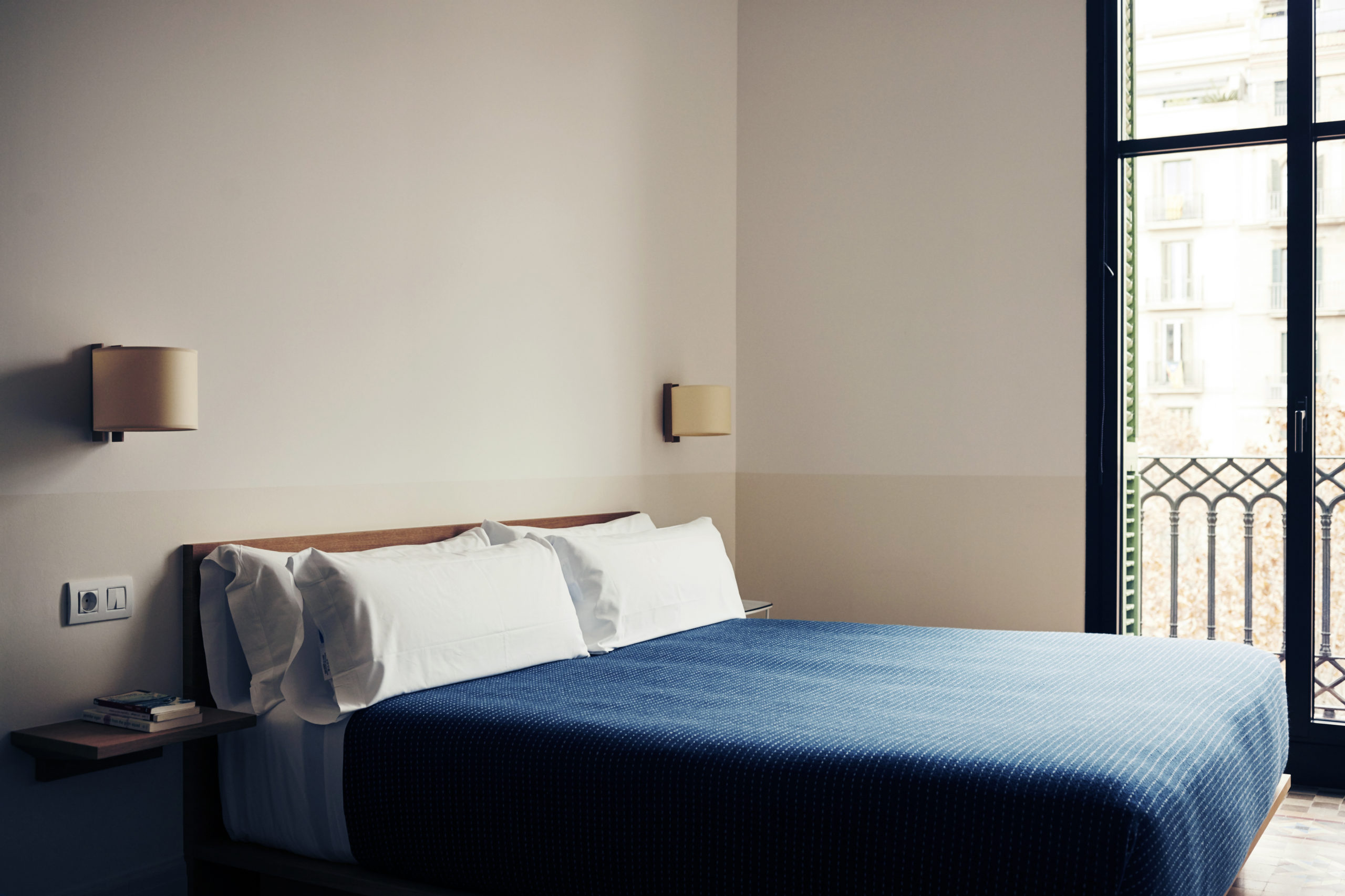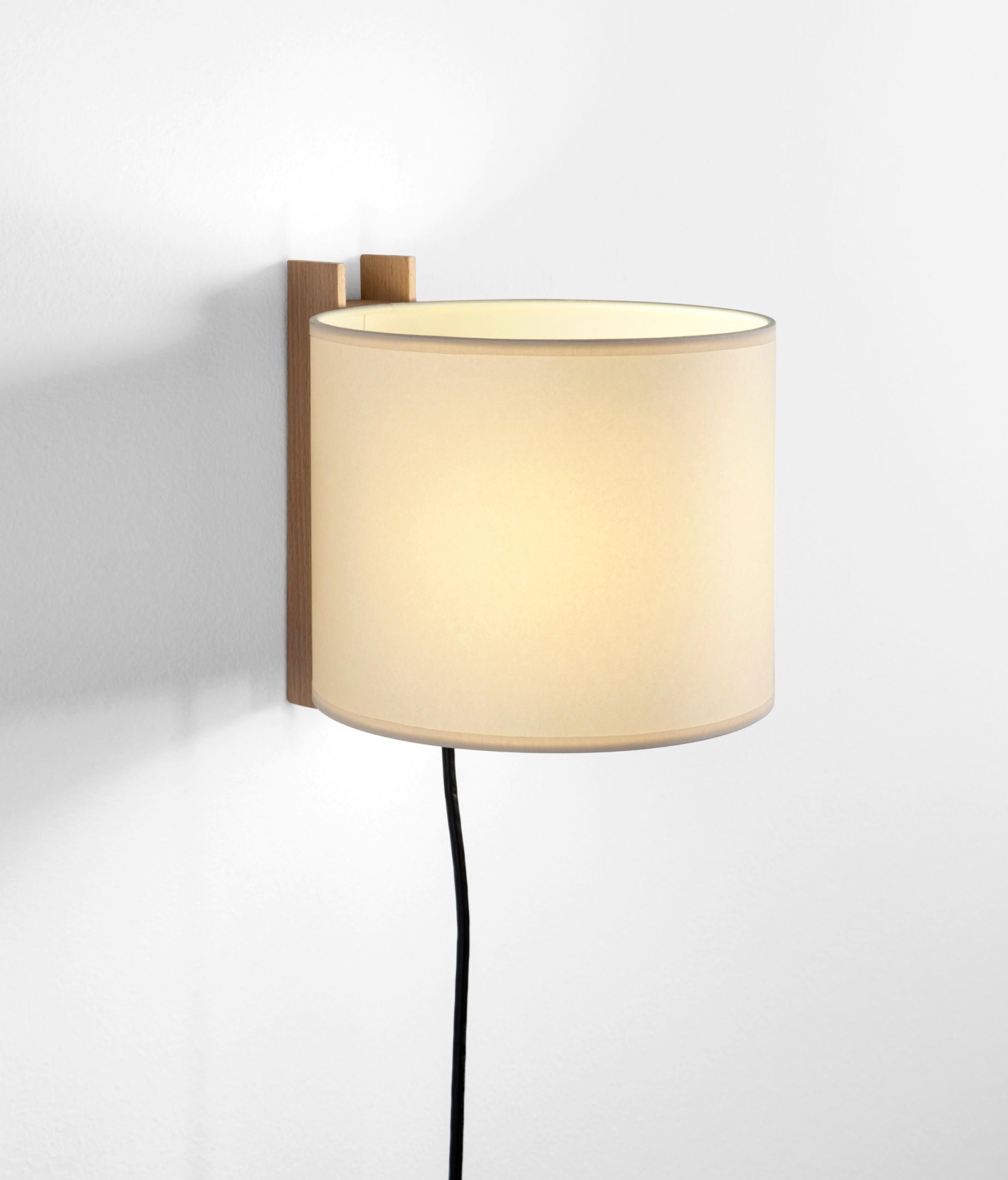 The TMM collection of short and long wall lamps comprises a simple beech channel into which the white or beige parchment shade is partially inserted. The short wall lamp can also come with the exterior cable, which doubles up as the light switch, or have a direct connection to the wall. The white version with direct wall connection comes with upper diffuser in white translucent methacrylate. In the plug connection the light is switched on/off by pulling lightly on the cable.