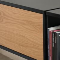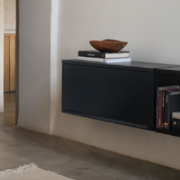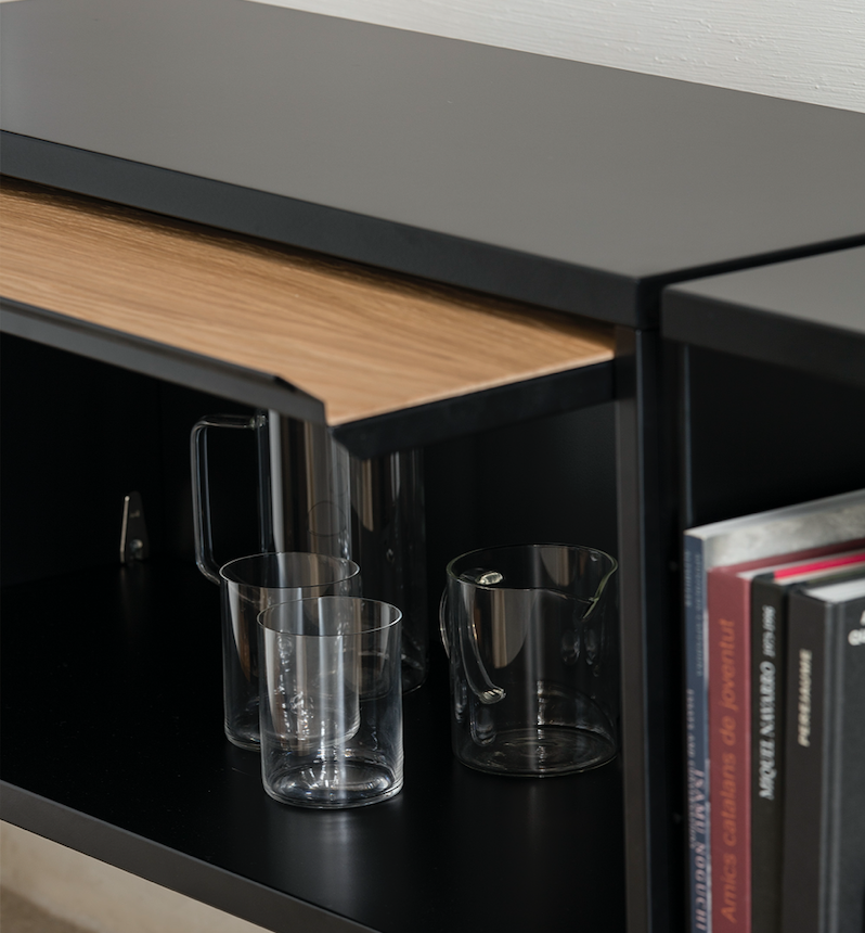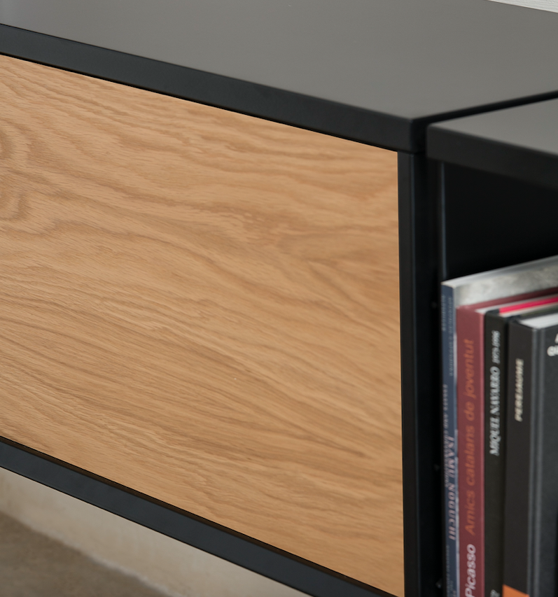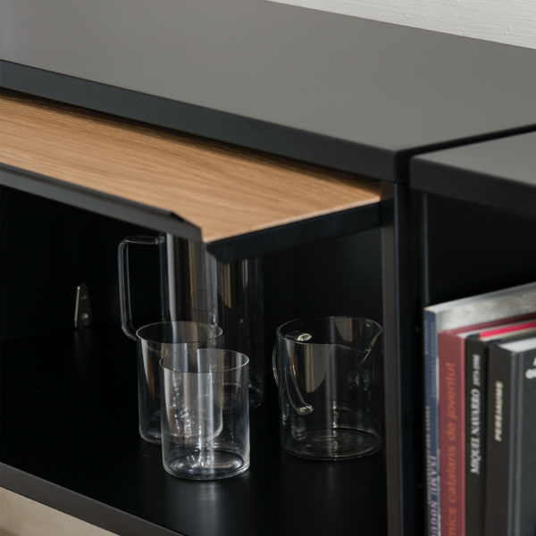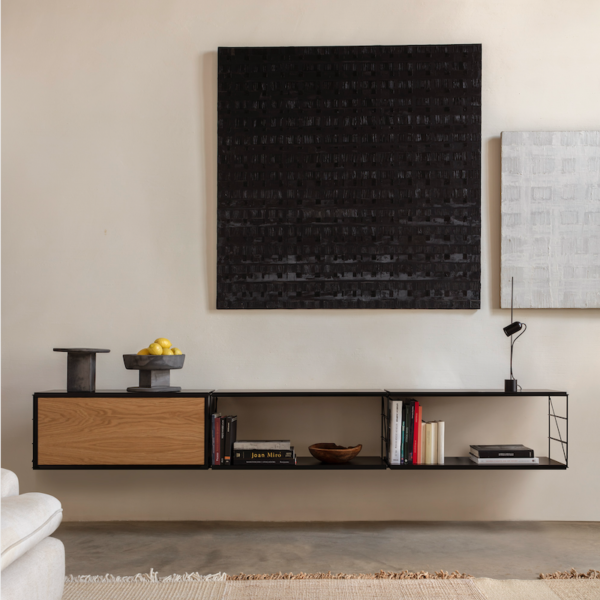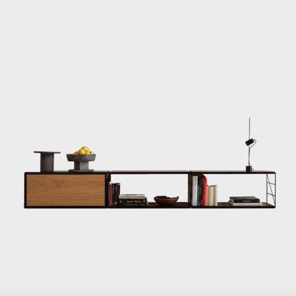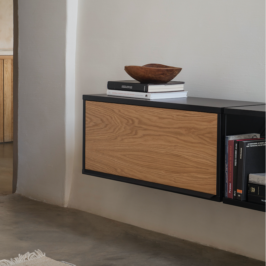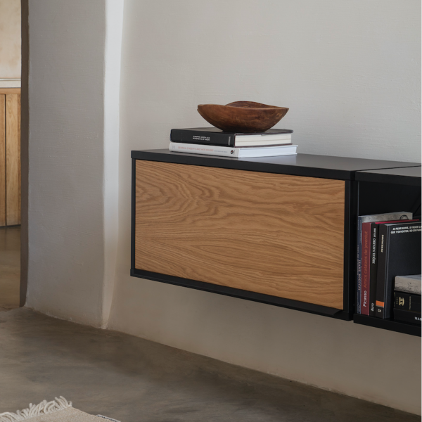 Wall hanging unit. Finishes and modules as per main picture: Black structure, shelves and door cabinet top, oak door. Two two-shelves modules 900w and one flip-up door cabinet two 900w. For more custom options, please contact us.