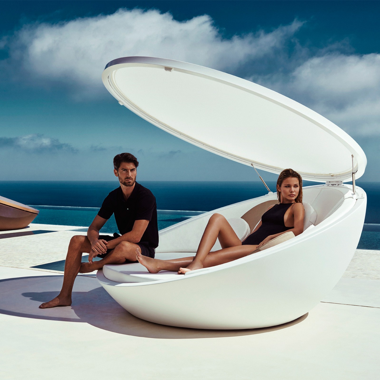 Made of polyethylene resin by rotational moulding. 100% Recyclable. Suitable for indoor and outdoor use. Swivel base 360. It doesn’t include the pillows.
