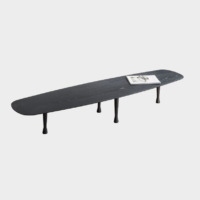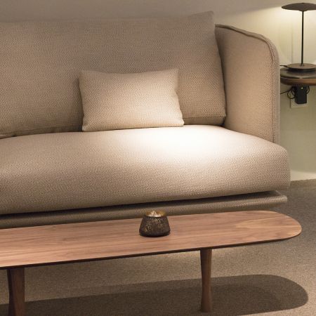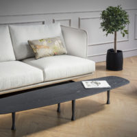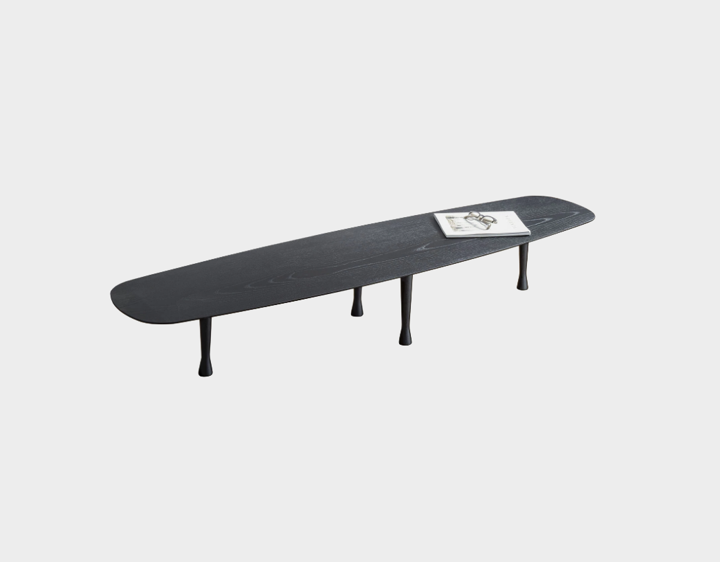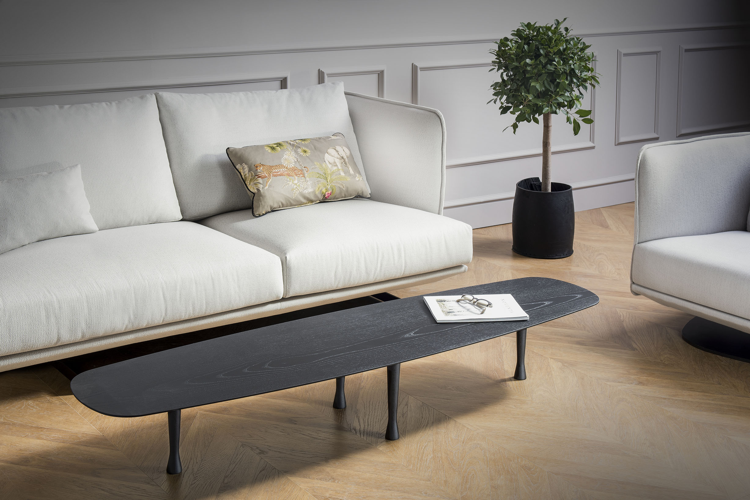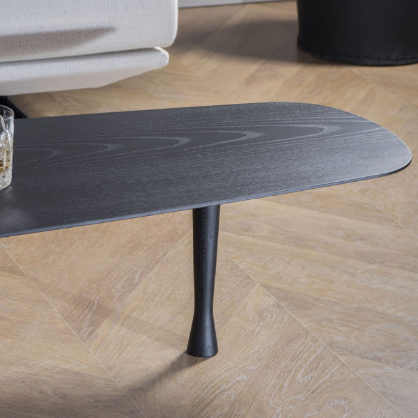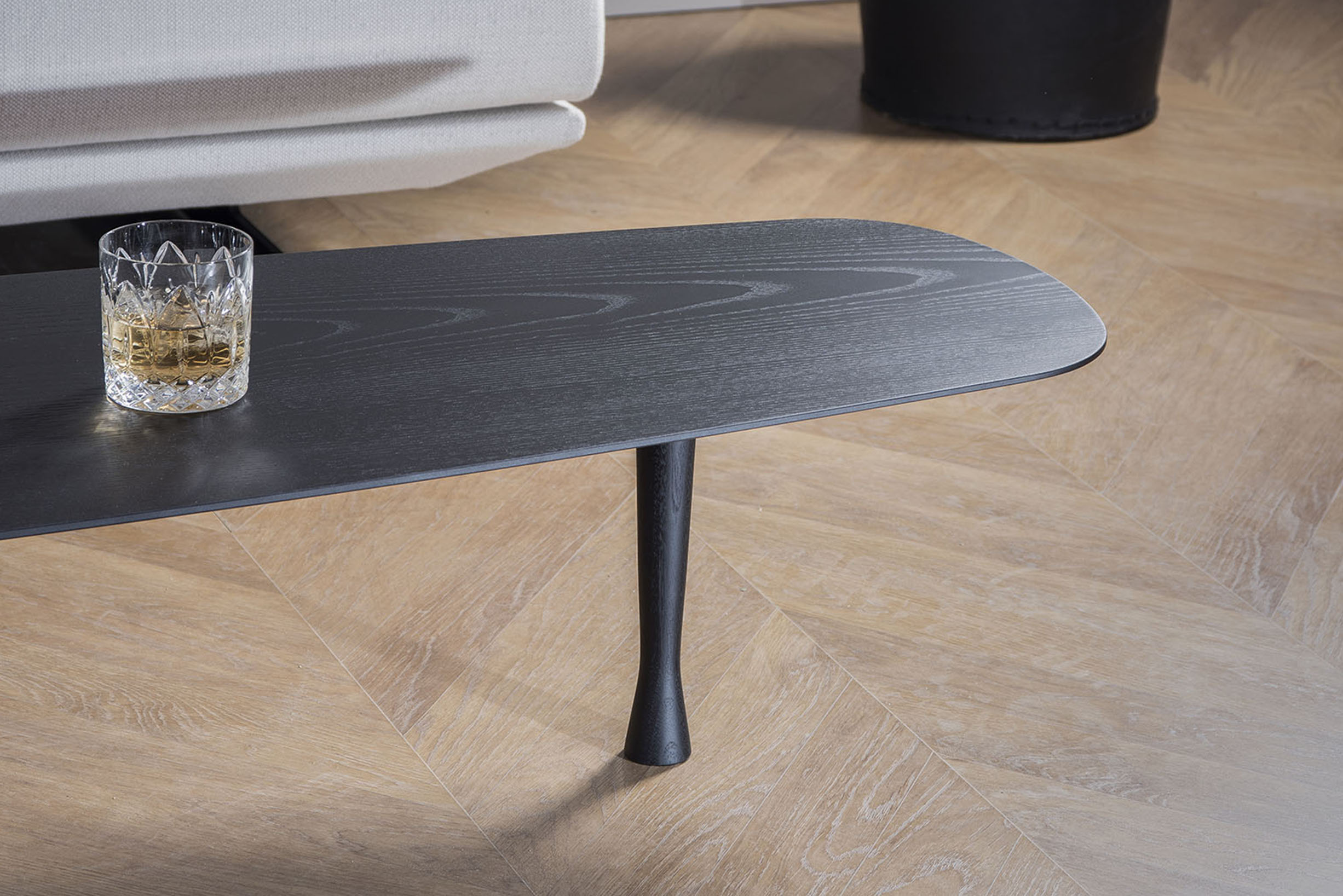 Organic design, subtile and essential. Discreet in height and monochromatic finish in black or natural walnut. Innovative positioning on the legs on a diamond shape.