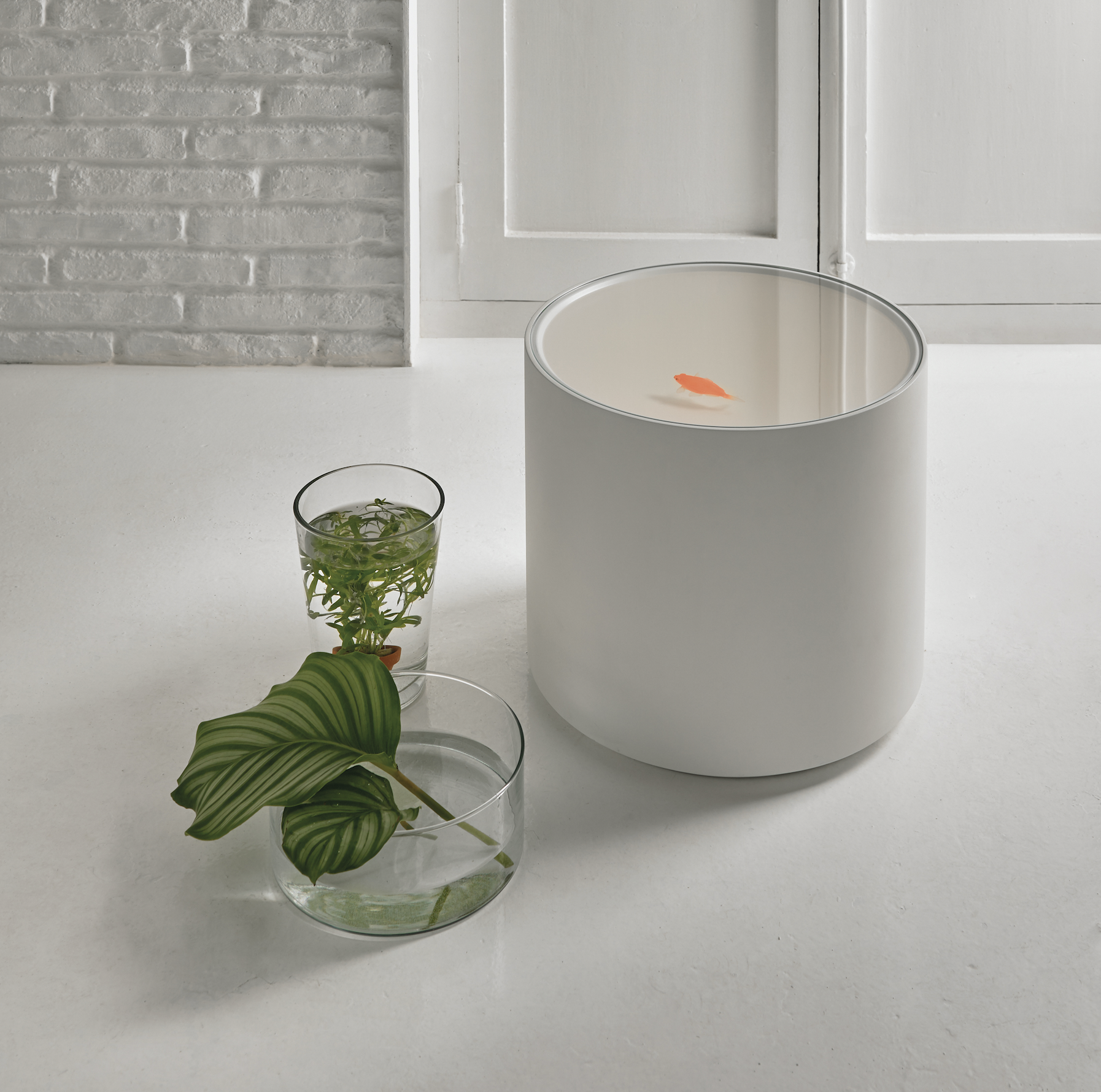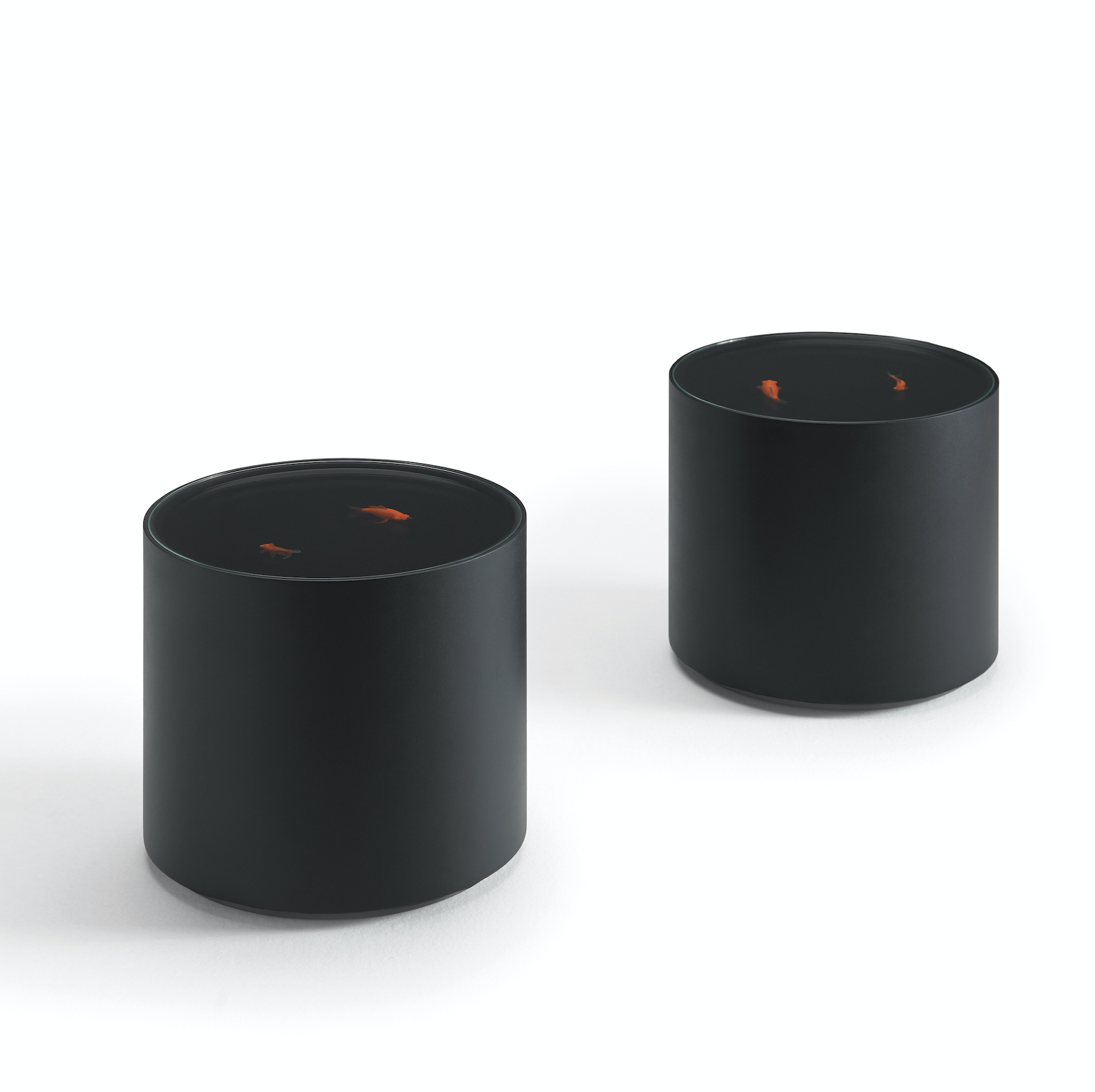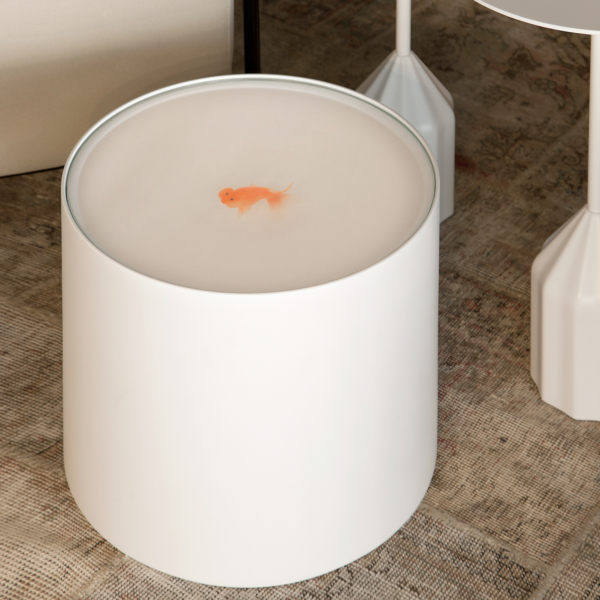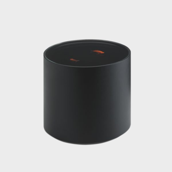 A subtle option for singular spaces with its fish floating in a lacquered cylinder, with no decoration other than themselves.