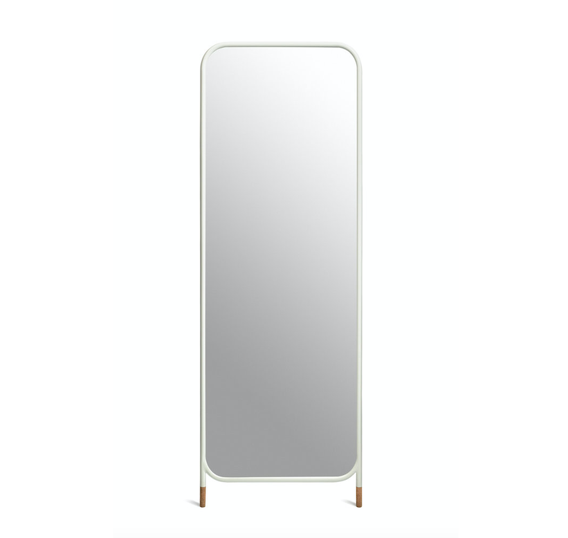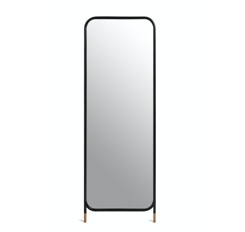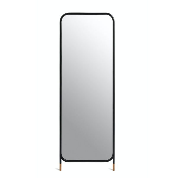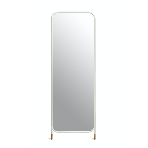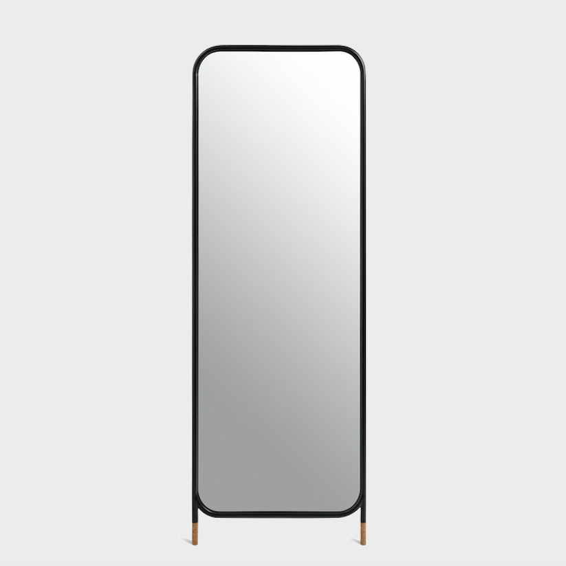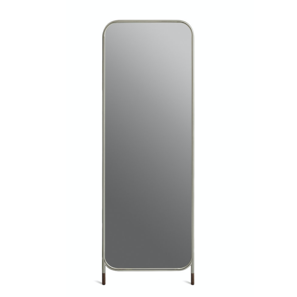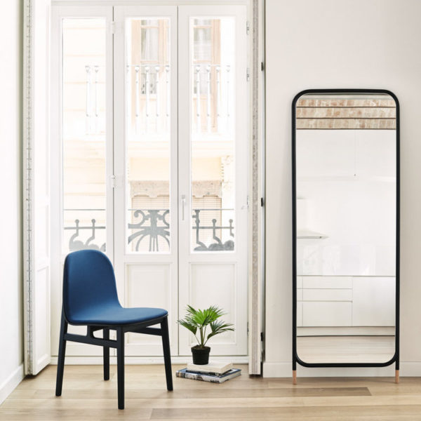 Mirror collection is a collection of wall mirrors in different geometric shapes, both circular and rectangular. The collection has three models of mirrors, a circular mirror with legs, a vertical, rectangular mirror with legs and a circular mirror to hang on the wall. Designed to lean against orbe fixed to the wall, their simple, contemporary lines play with a metal structure finished with two cork feet to prevent slipping.