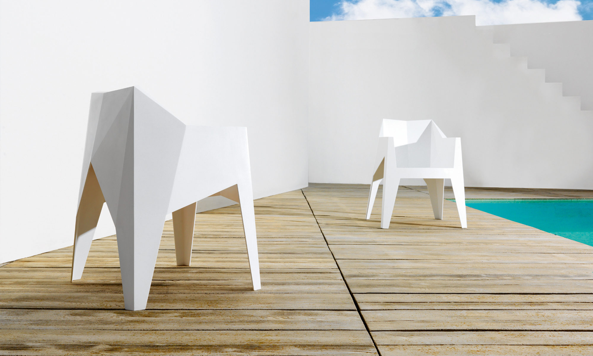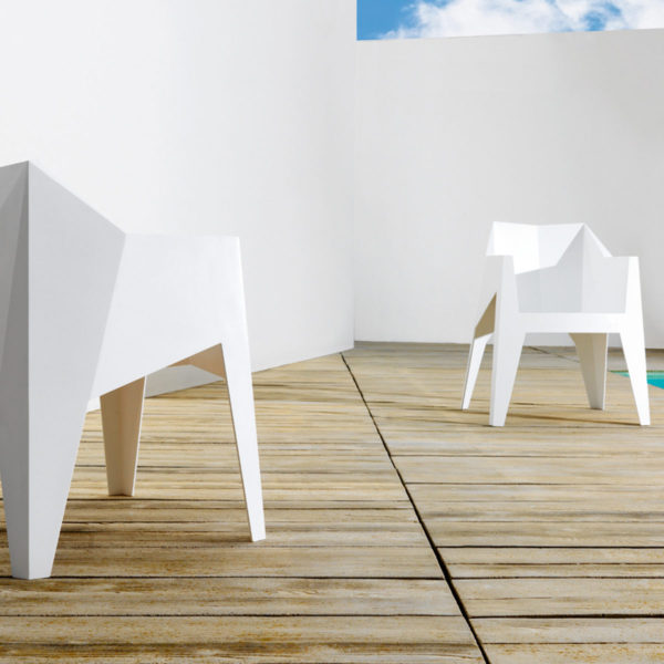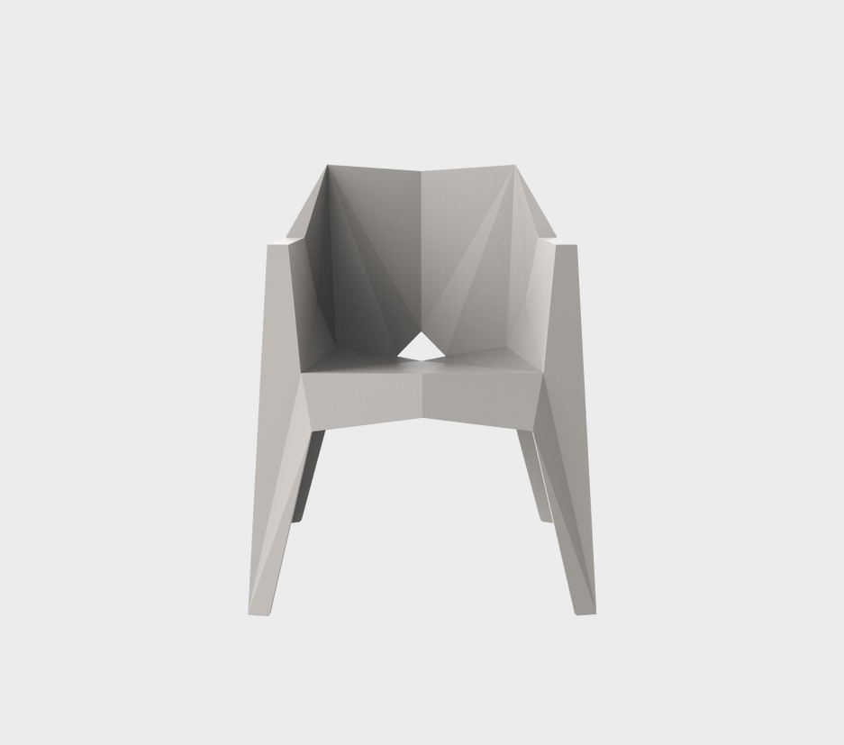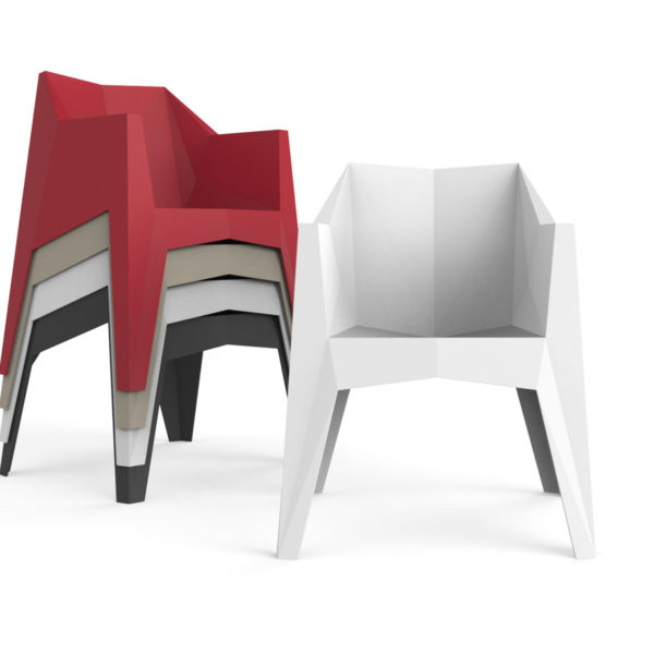 Now this collection is made up of the chair and the armchair. It is the perfect conceptual architectural piece for any space. Its lightweight body makes it easy to transport and arrange. The armchair is a minimal simple yet voluminous stackable chair that is faceted just in the perfect places for comfort, just in the right angles for hyper-strength, imbuing the correct creases for beauty, and just the few merging and converging lines for purity. Made of injected polypropylene.