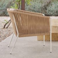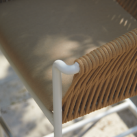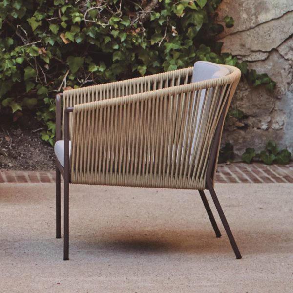 Epoxy baked lacquered aluminium frame, polyester rope weaving . In three finishes: 63 Taupe Grey Nougat Rope, 60 Taupe Grey Taupe Rope and 61 Cream Nougat Rope (see colours in spec sheet). High resistance cushions in 40kg rubber foam with fabric cover from Point’s sample book.