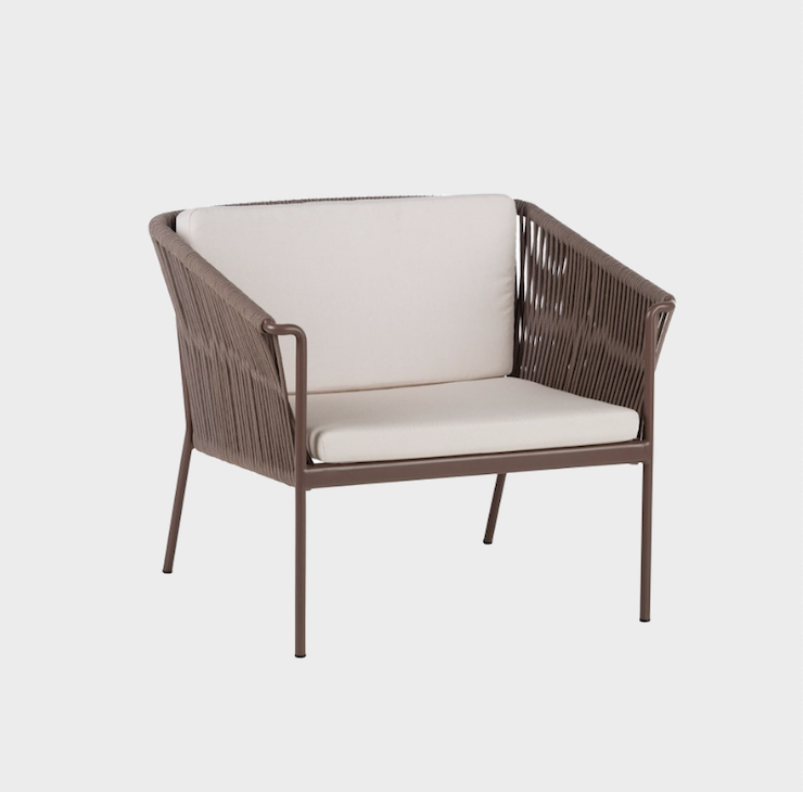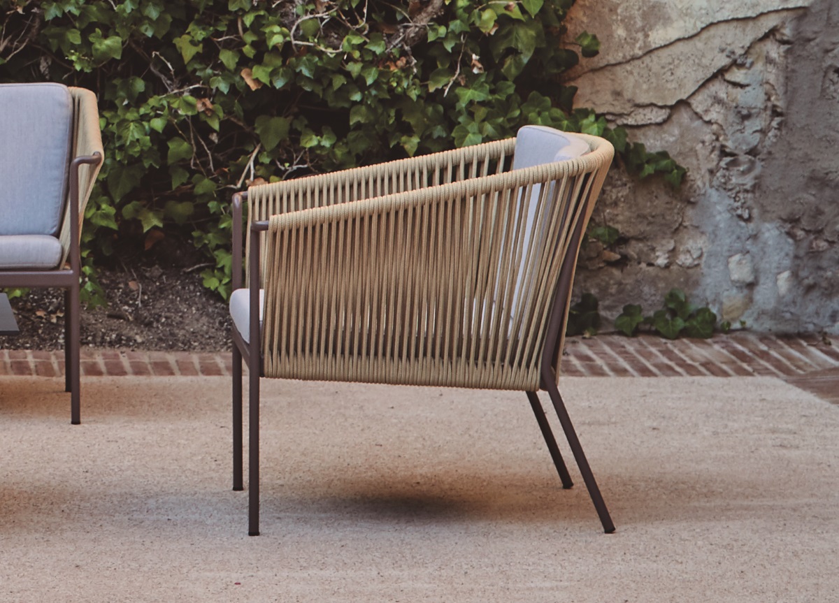 Epoxy baked lacquered aluminium frame, polyester rope weaving . In three finishes: 63 Taupe Grey Nougat Rope, 60 Taupe Grey Taupe Rope and 61 Cream Nougat Rope (see colours in spec sheet). High resistance cushions in 40kg rubber foam with fabric cover from Point’s sample book.