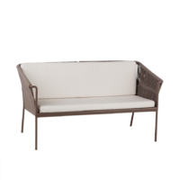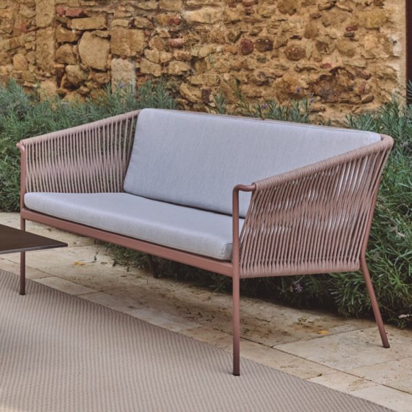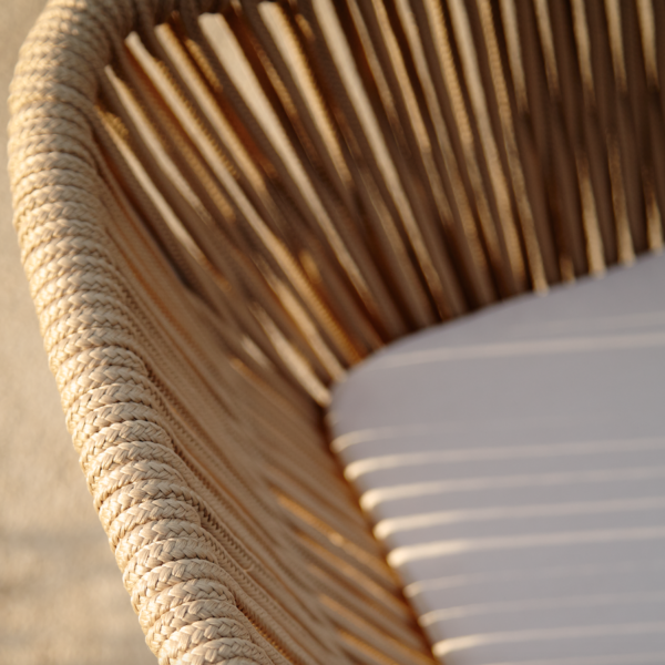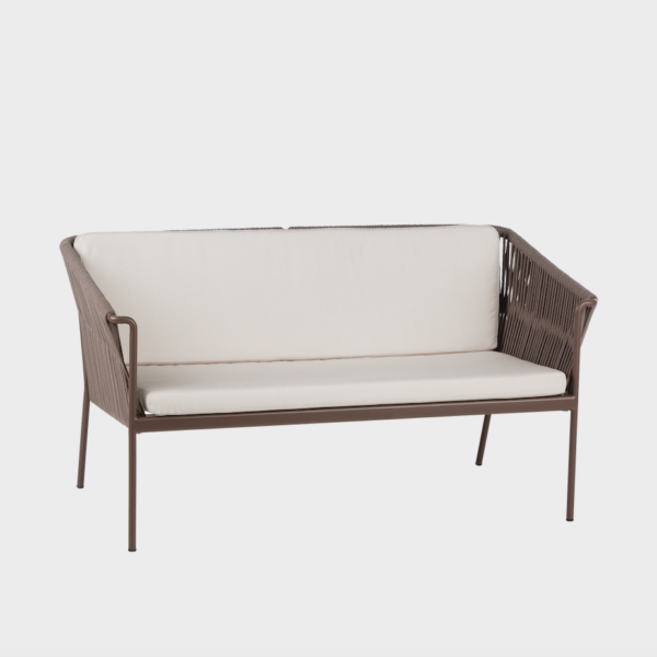 Epoxy baked lacquered aluminium frame, polyester rope weaving . In three finishes: 63 Taupe Grey Nougat Rope, 60 Taupe Grey Taupe Rope and 61 Cream Nougat Rope (see colours in spec sheet). High resistance cushions in 40kg rubber foam with fabric cover from Point’s sample book.