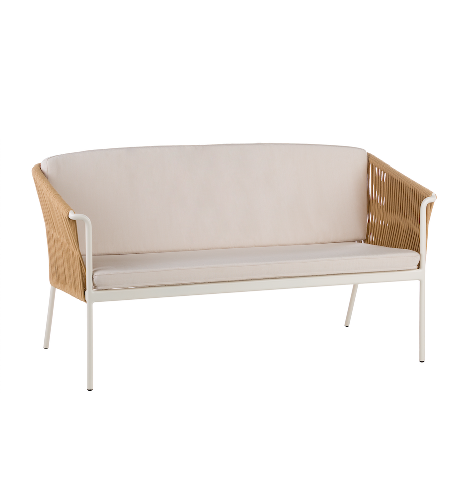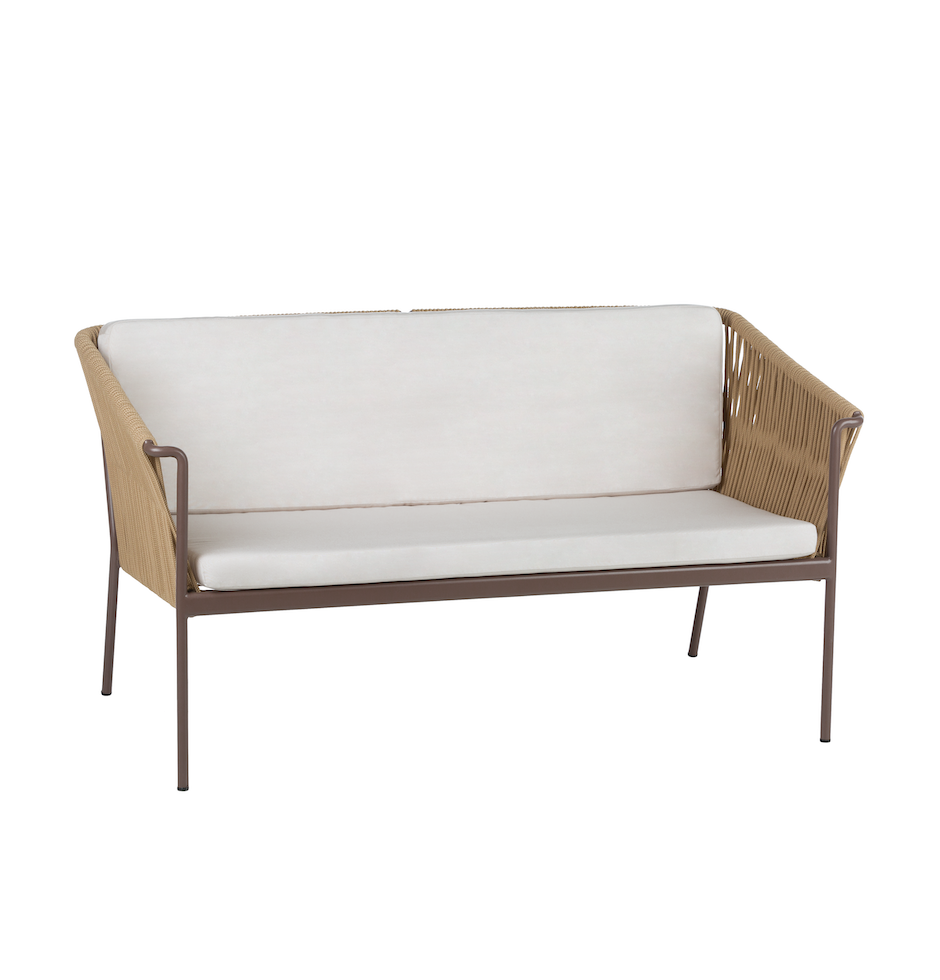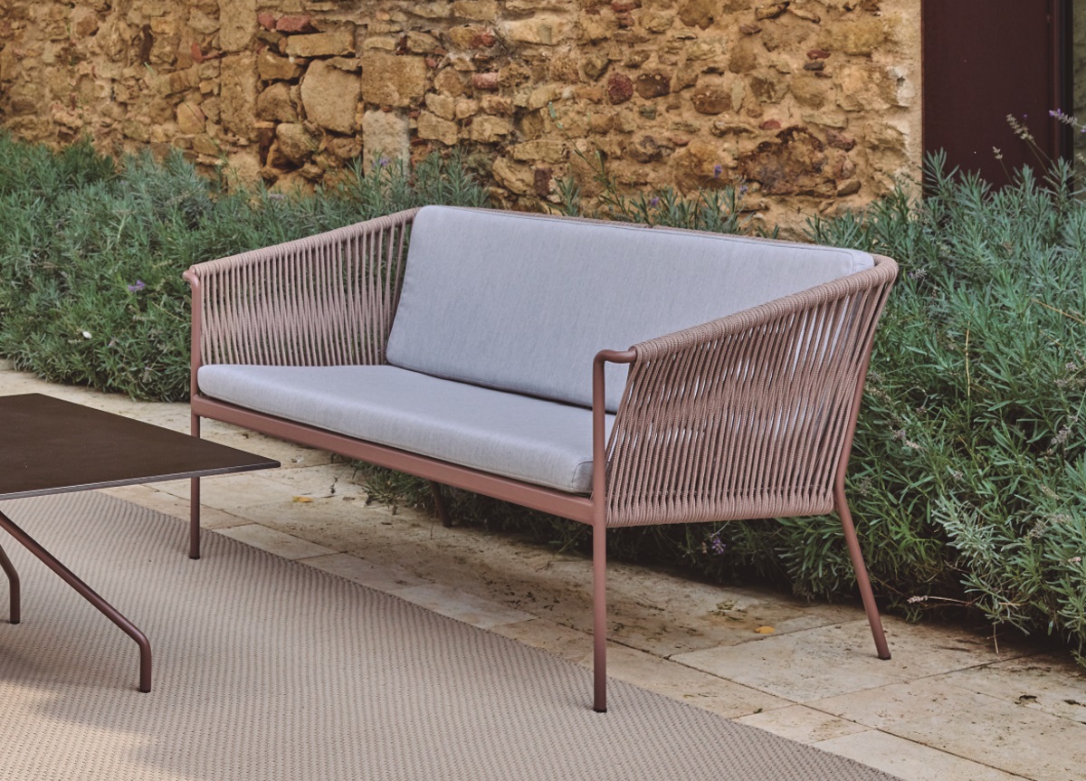 Epoxy baked lacquered aluminium frame, polyester rope weaving . In three finishes: 63 Taupe Grey Nougat Rope, 60 Taupe Grey Taupe Rope and 61 Cream Nougat Rope (see colours in spec sheet). High resistance cushions in 40kg rubber foam with fabric cover from Point’s sample book.