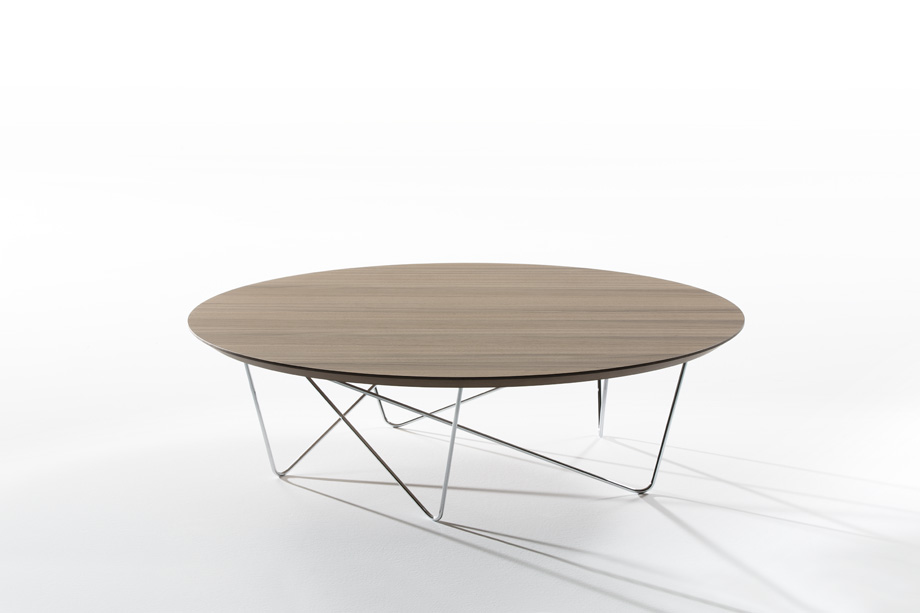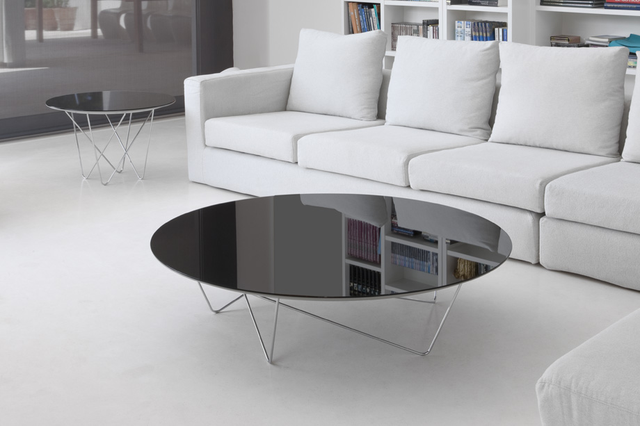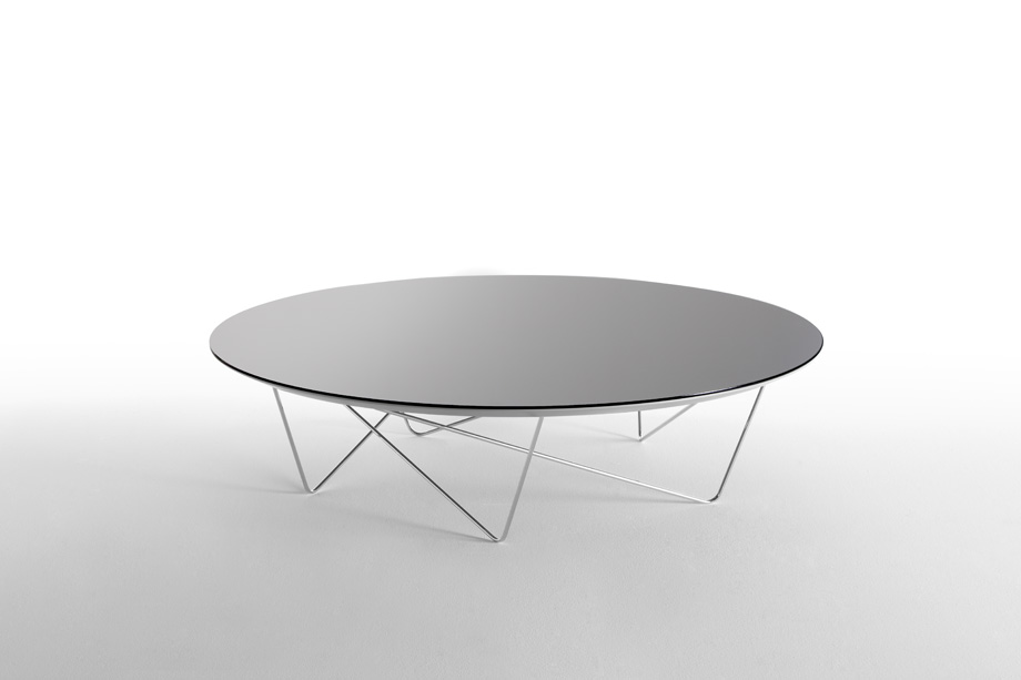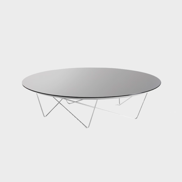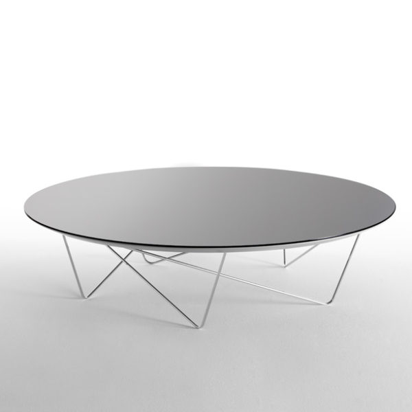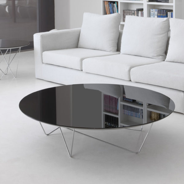 Coffee tables composed of circular top and oval metal rods. The tabletop can optionally be supplied in smoked grey mirror, bronze mirror, walnut, oak or black glass. The metal legs can optionally be supplied in black or chrome.