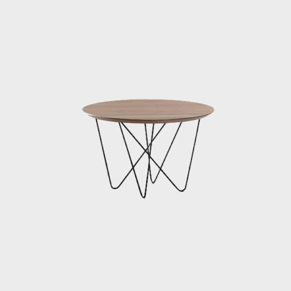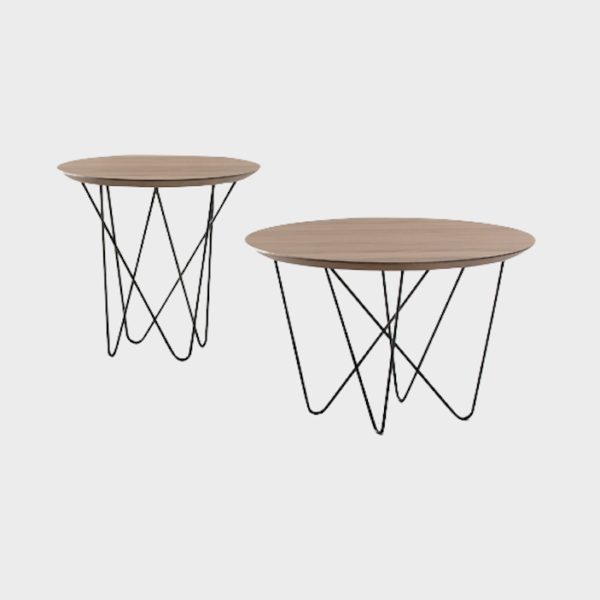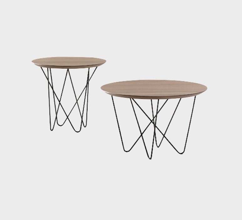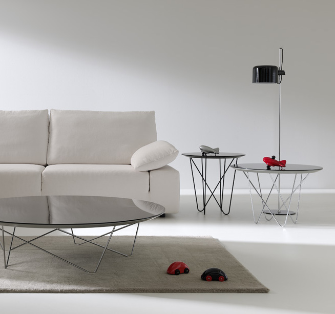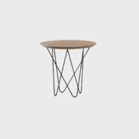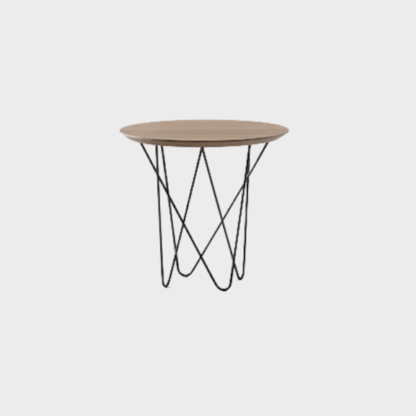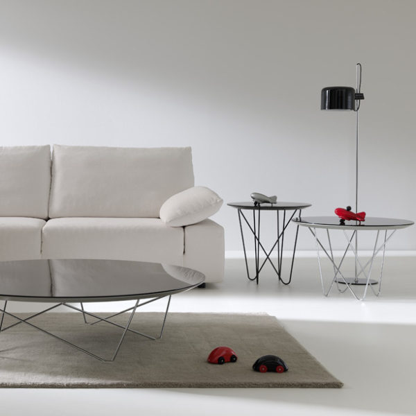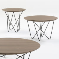 Side tables composed of circular top and oval metal rods. The tabletop can optionally be supplied in smoked grey mirror, bronze mirror, walnut, oak or black glass. The metal legs can optionally be supplied in black or chrome.