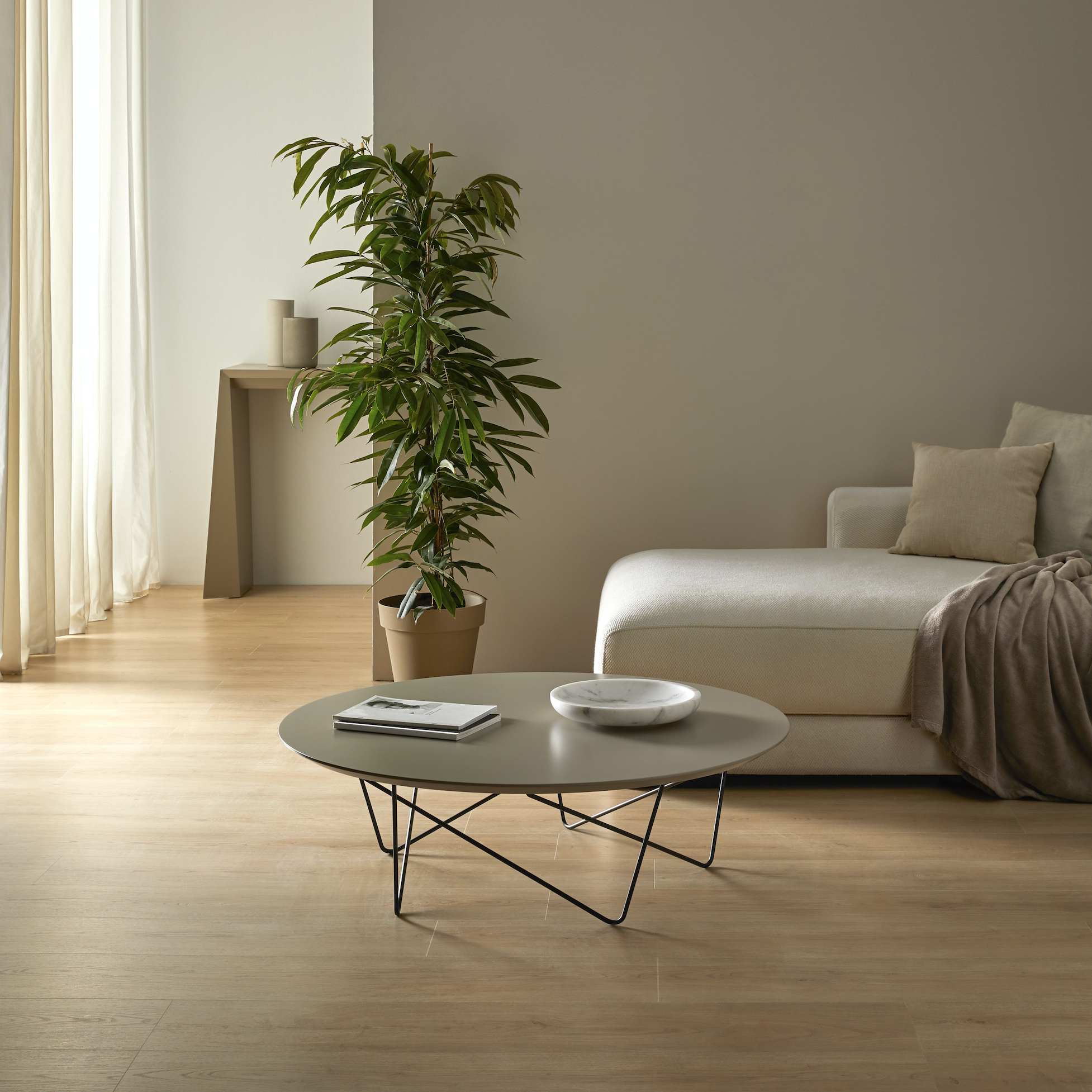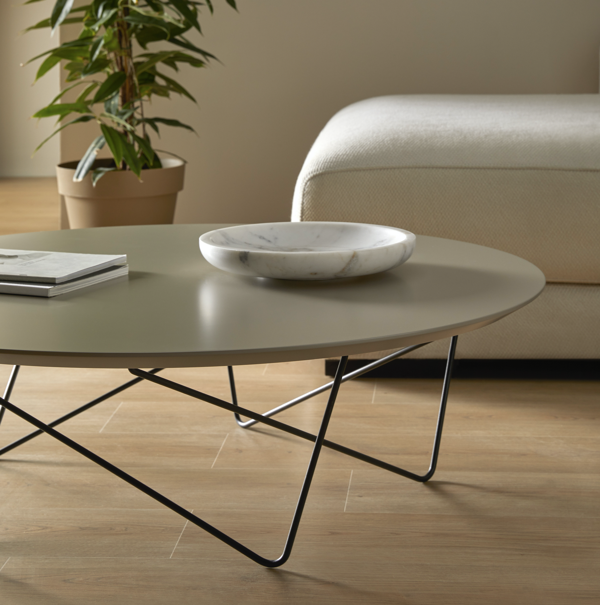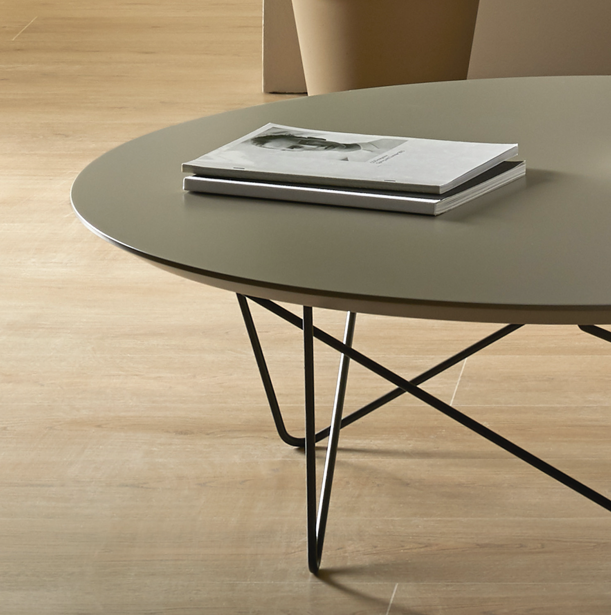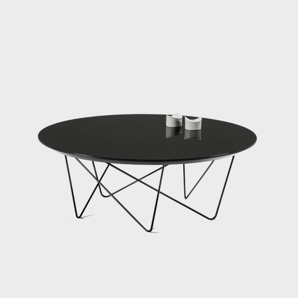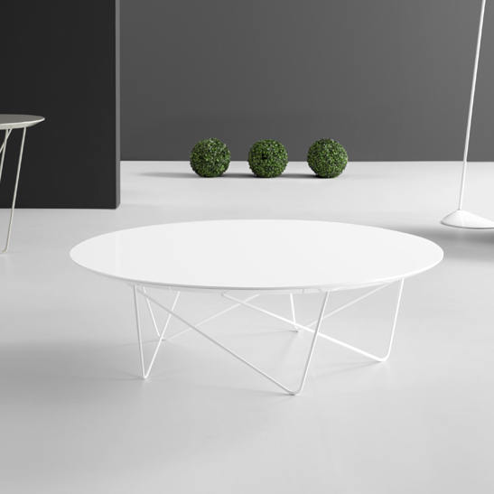 Coffee tables composed of circular top and oval metal rods. Tabletop in any of the lacquers available in finishes. The metal legs can optionally be supplied in lacquer or chrome. Please specify lacquer colour and height: 300 or 380 mm.