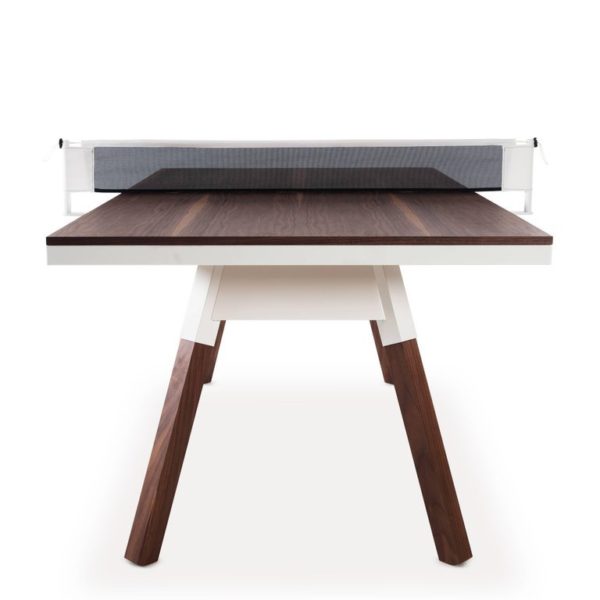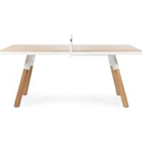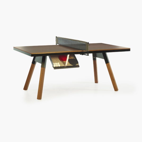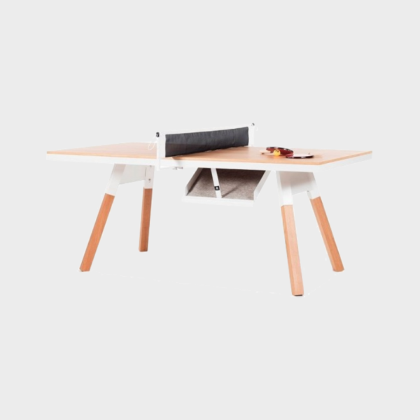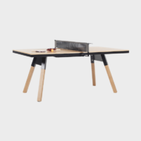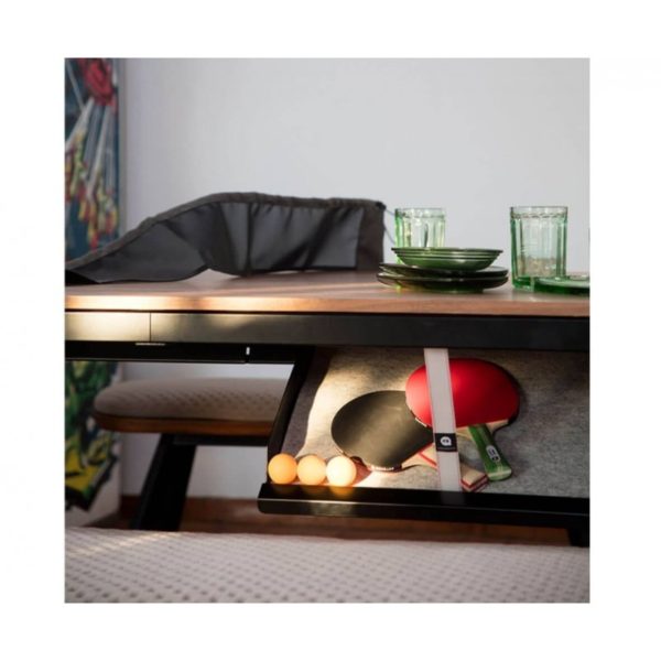 You and Me is a stunning contemporary ping-pong table with the playing surface, elegant design and robust structure that gives it full playability. You & Me is versatile too – it can be used as a dining table, a meeting table, work or play surface! All the sportiness You & Me gets from the net, bats, and balls can be stored in the side drawer and hidden away completely. This version enjoys a natural walnut or oak veneer playing surface for the ultimate luxury. Small size: 1800w x 1000d x 760h mm. Includes net, 6 balls, and 2 paddles. Only indoor use.