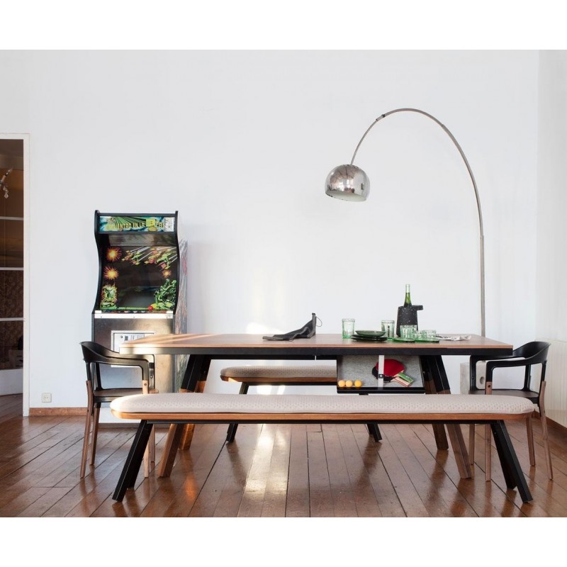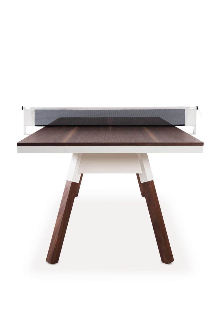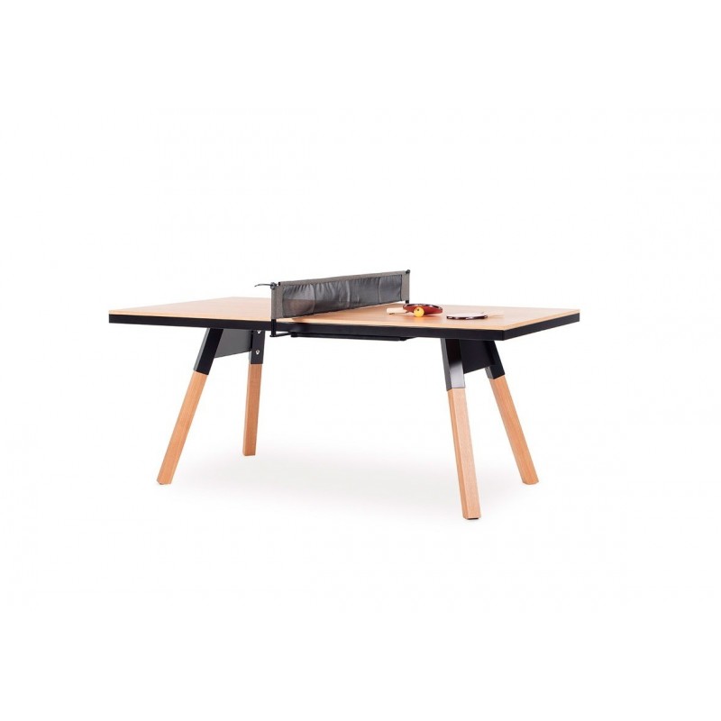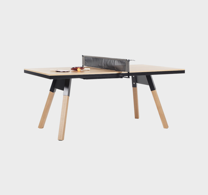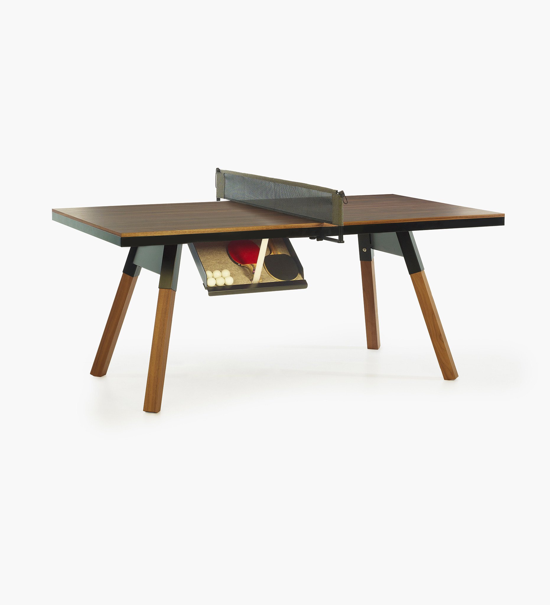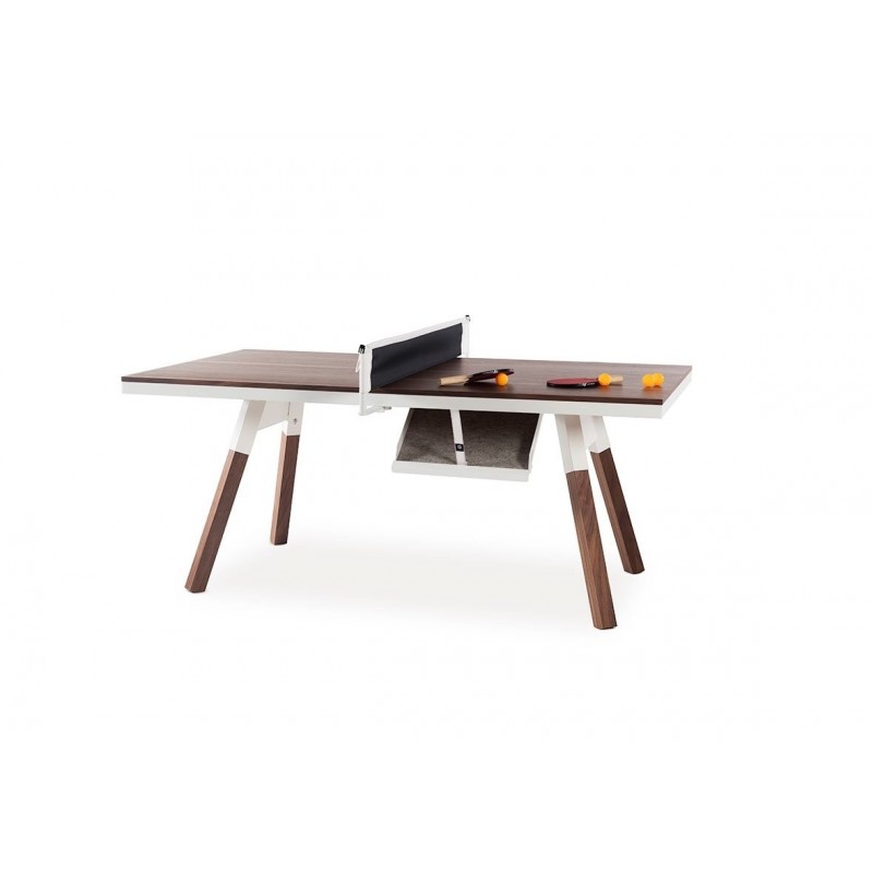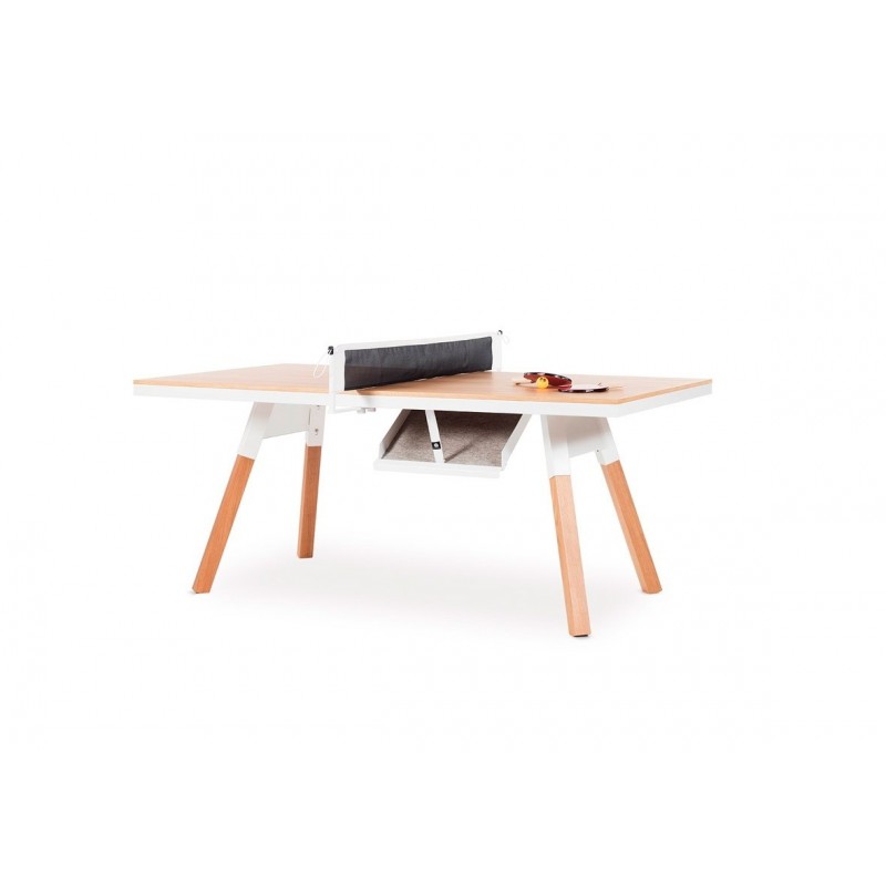 You and Me is a stunning contemporary ping-pong table with the playing surface, elegant design and robust structure that gives it full playability. You & Me is versatile too – it can be used as a dining table, a meeting table, work or play surface! All the sportiness You & Me gets from the net, bats, and balls can be stored in the side drawer and hidden away completely. This version enjoys a natural walnut or oak veneer playing surface for the ultimate luxury. Small size: 1800w x 1000d x 760h mm. Includes net, 6 balls, and 2 paddles. Only indoor use.